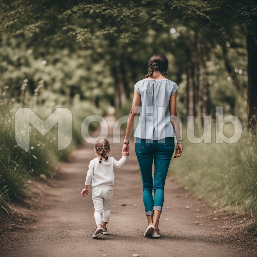 Amidst lush greenery, a tender scene unfolds as a mother strolls hand in hand with her child. The duo moves through nature’s embrace, sunlight dappling their path. The mother’s nurturing presence radiates warmth, while the child’s innocent wonder blossoms with each step. A tranquil symphony of rustling leaves accompanies this idyllic journey, forging a timeless bond in the heart of nature’s haven, where love and greenery intertwine in a harmonious dance.