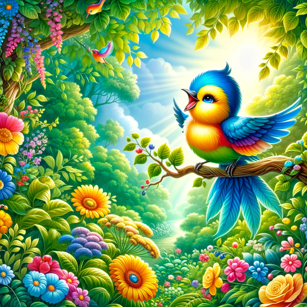 In the heart of the lush forest, a vibrant bird perches atop a swaying branch, its plumage a riot of colors against the verdant backdrop. Surrounded by a kaleidoscope of vibrant flowers and lush foliage, it chirps joyfully, spreading happiness amidst nature’s tapestry. Each hue and chirp harmonize, creating a symphony of joy in this enchanting paradise.