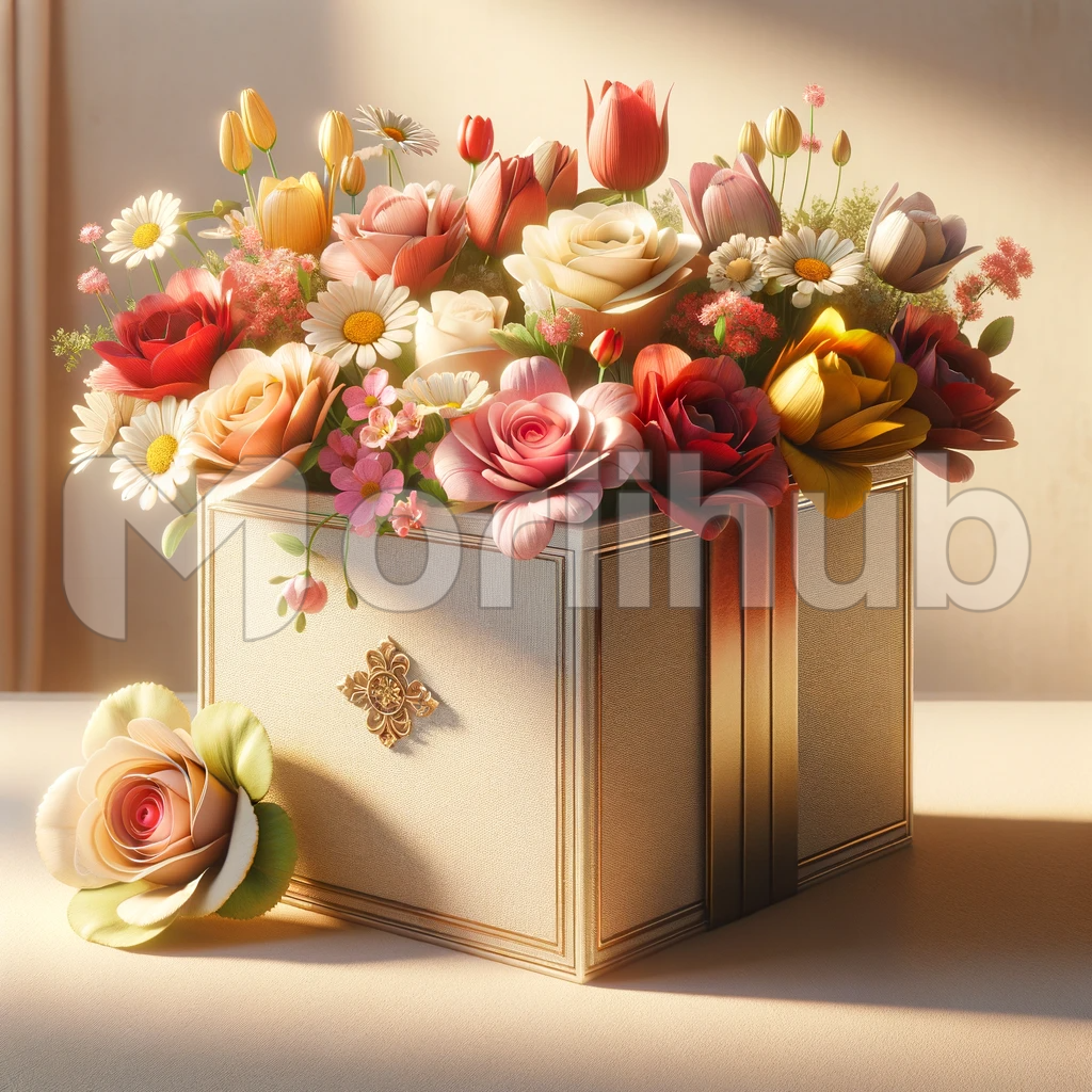 In this charming and delightful scene, a beautifully designed square gift box overflows with a kaleidoscope of vibrant flowers. The box itself is a work of art, exuding elegance with intricate detailing. Inside, an assortment of blooms bursts forth in a joyful riot of colors, a perfect representation of nature’s beauty captured within the confines of an exquisite gift. This image encapsulates the essence of thoughtful gifting and the sheer delight that a carefully chosen floral gift can bring.
