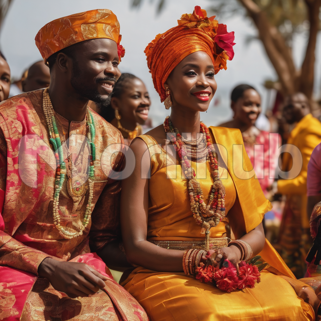 On their wedding day, a joyous African couple sits side by side, radiating love and happiness. She wears a stunning white gown adorned with intricate beading, and he dons a sharp suit with a confident smile. Their eyes meet, filled with hope and excitement for the future. Surrounded by friends and family, their laughter fills the air as they celebrate the union of two hearts, a day marked by love, tradition, and the promise of a beautiful journey together.