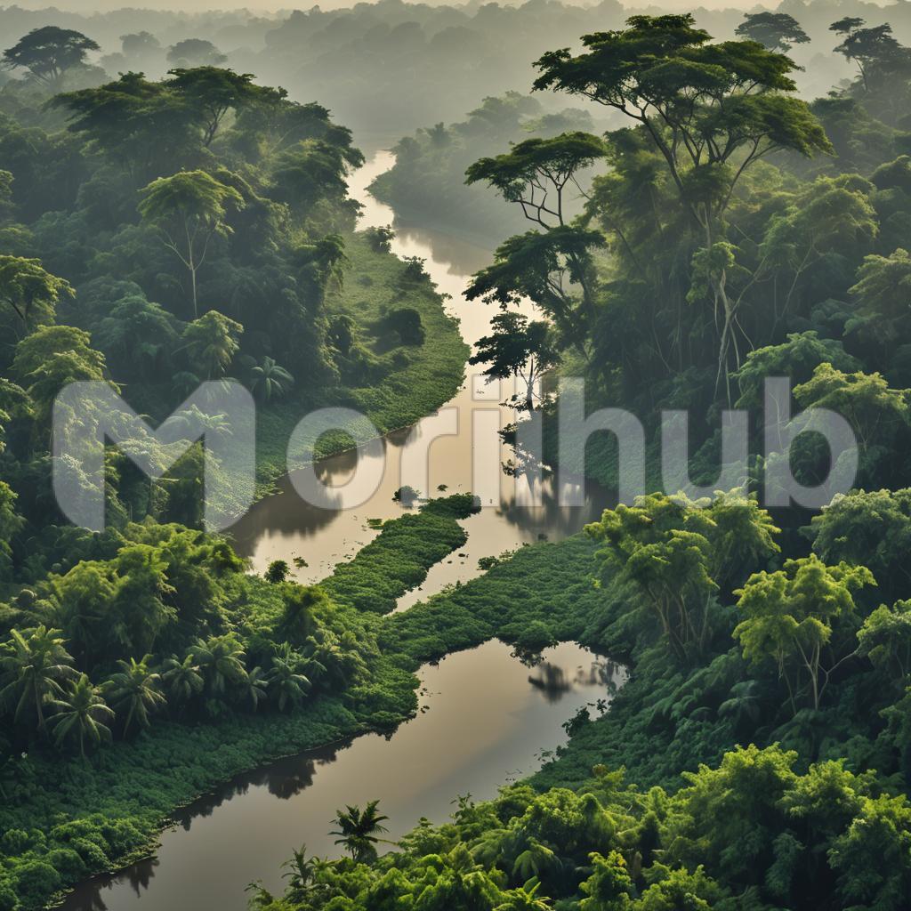 Deep within the heart of a lush green jungle, a winding river snakes its way through the dense foliage. The water, clear and cool, reflects the vibrant greenery that surrounds it, creating a stunning contrast with the dark, earthy tones of the jungle floor. Towering trees with thick canopies loom overhead, their leaves whispering in the breeze. Along the riverbanks, vibrant tropical flowers and ferns thrive, adding splashes of color to the verdant landscape. The river flows gently, its surface occasionally disturbed by the playful splash of fish or the graceful glide of a water bird. This tranquil river is a lifeline for the jungle, nourishing the diverse wildlife that calls this pristine wilderness home.