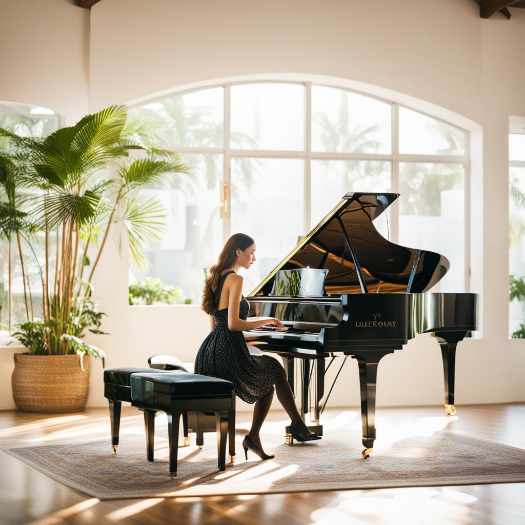 In a dimly lit room, a woman sits gracefully at the piano, her fingers dancing across the keys with effortless skill. The melody she creates is a symphony of emotions, resonating through the air. Her eyes are closed, immersed in the music, and her passion brings each note to life, creating a soul-stirring performance that captivates the senses and transports listeners to an enchanting realm of sound and expression.