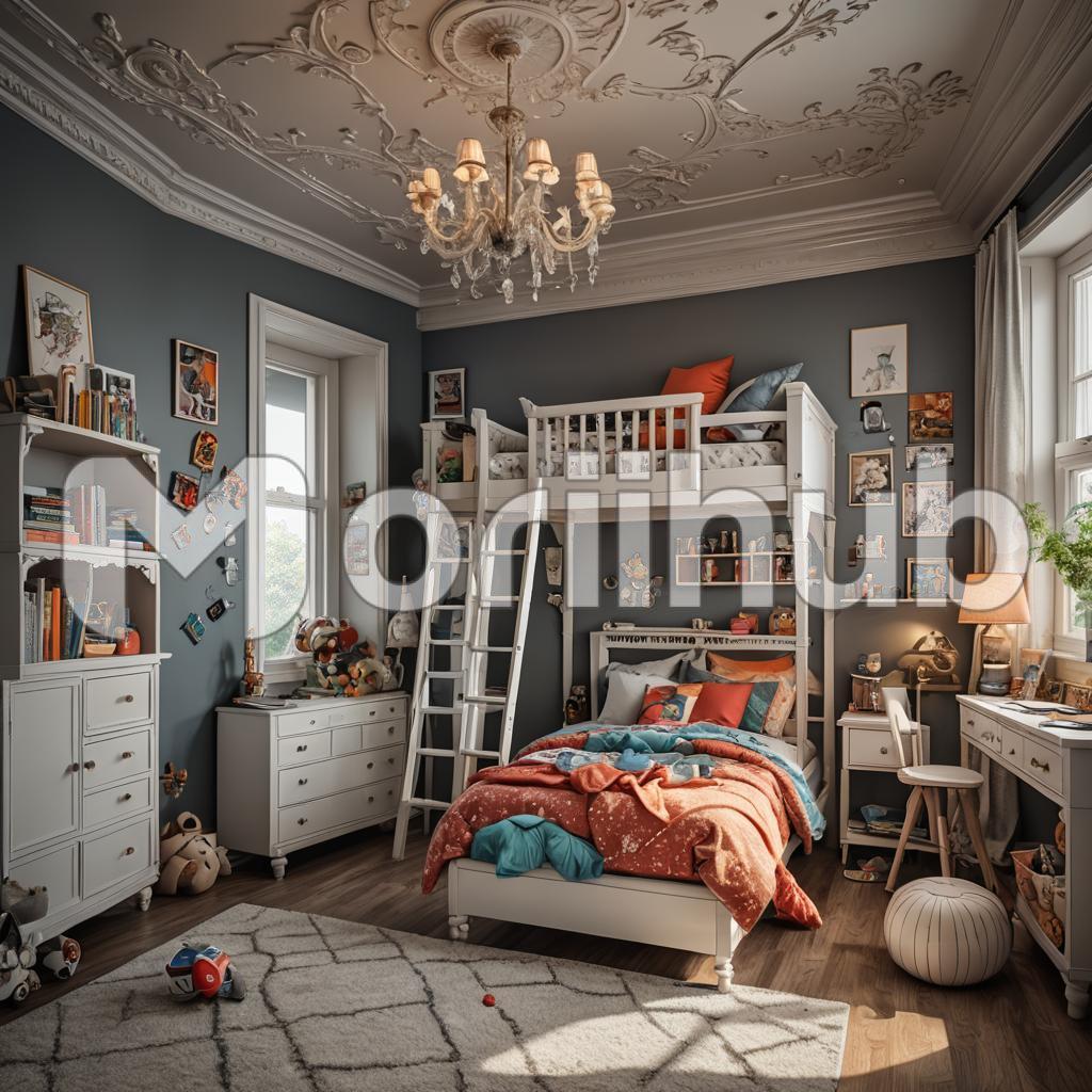 A cheerful children’s room bursts with color and creativity, designed to inspire and delight young minds. The walls are painted in a soft pastel blue, adorned with whimsical murals of animals and nature scenes. A bunk bed, with cozy, vibrant bedding, stands against one wall, while a small wooden desk, scattered with crayons and drawing paper, sits near a window. The floor is covered with a soft, patterned rug, perfect for playtime. Shelves filled with books, toys, and stuffed animals line another wall, creating an organized yet playful atmosphere.