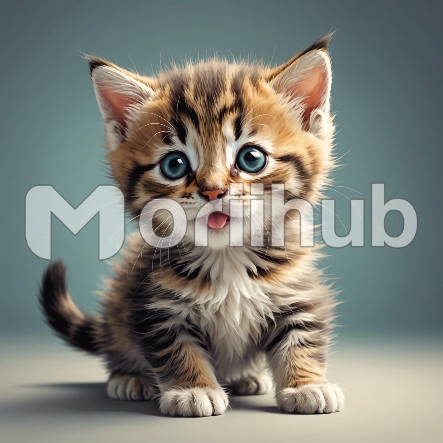 Against a plain backdrop, a cute kitten sits with endearing innocence, its eyes wide with curiosity and wonder. Its fluffy fur, adorned with patches of various hues, adds to its undeniable charm. With delicate paws neatly tucked under its body, it exudes a sense of contentment and tranquility. The simplicity of the background accentuates the kitten’s adorable presence, inviting admiration and affection. In this serene moment, the kitten’s quiet grace and innocent gaze captivate the viewer, offering a glimpse into the beauty of feline companionship.