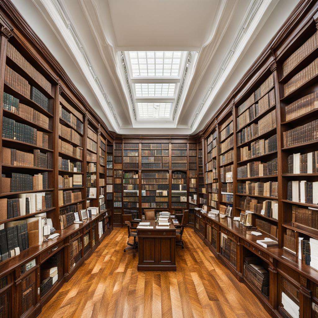 The library office is a haven of intellectual pursuit and organizational diligence. Rows of towering bookshelves line the walls, filled with volumes of knowledge. A large mahogany desk sits at the center, adorned with neatly stacked papers and a vintage desk lamp, casting a warm glow on scholarly endeavors. The atmosphere exudes a quiet intensity, fostering focus and creativity.