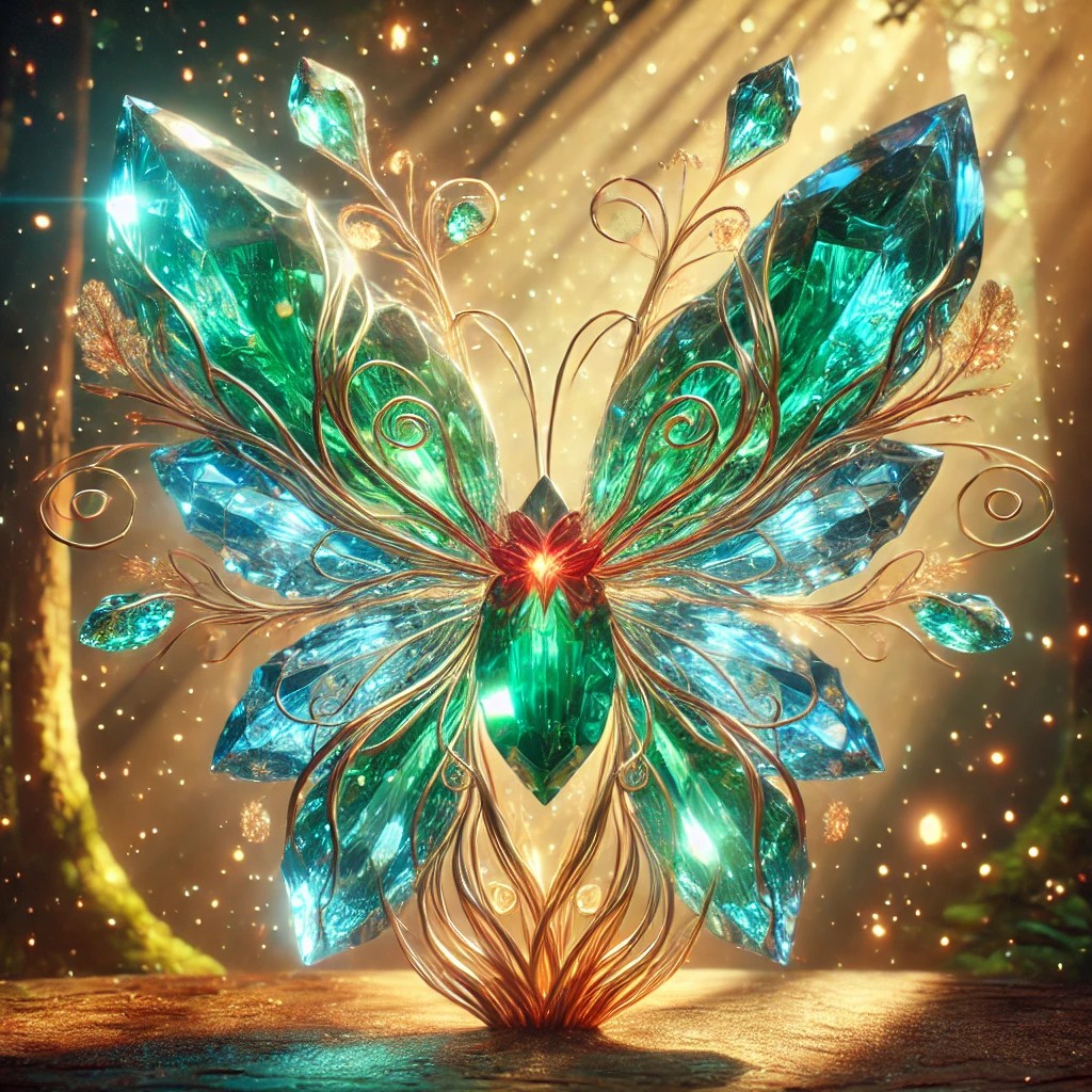 The image showcases a breathtaking crystal butterfly, glowing with the essence of life. Its delicate wings are crafted from translucent emerald and sapphire-like crystal, shimmering with an ethereal glow. The body of the butterfly is formed from a radiant golden gemstone, pulsating with warmth and vitality. Swirling veins of magical energy course through the wings, resembling the flow of life itself.
