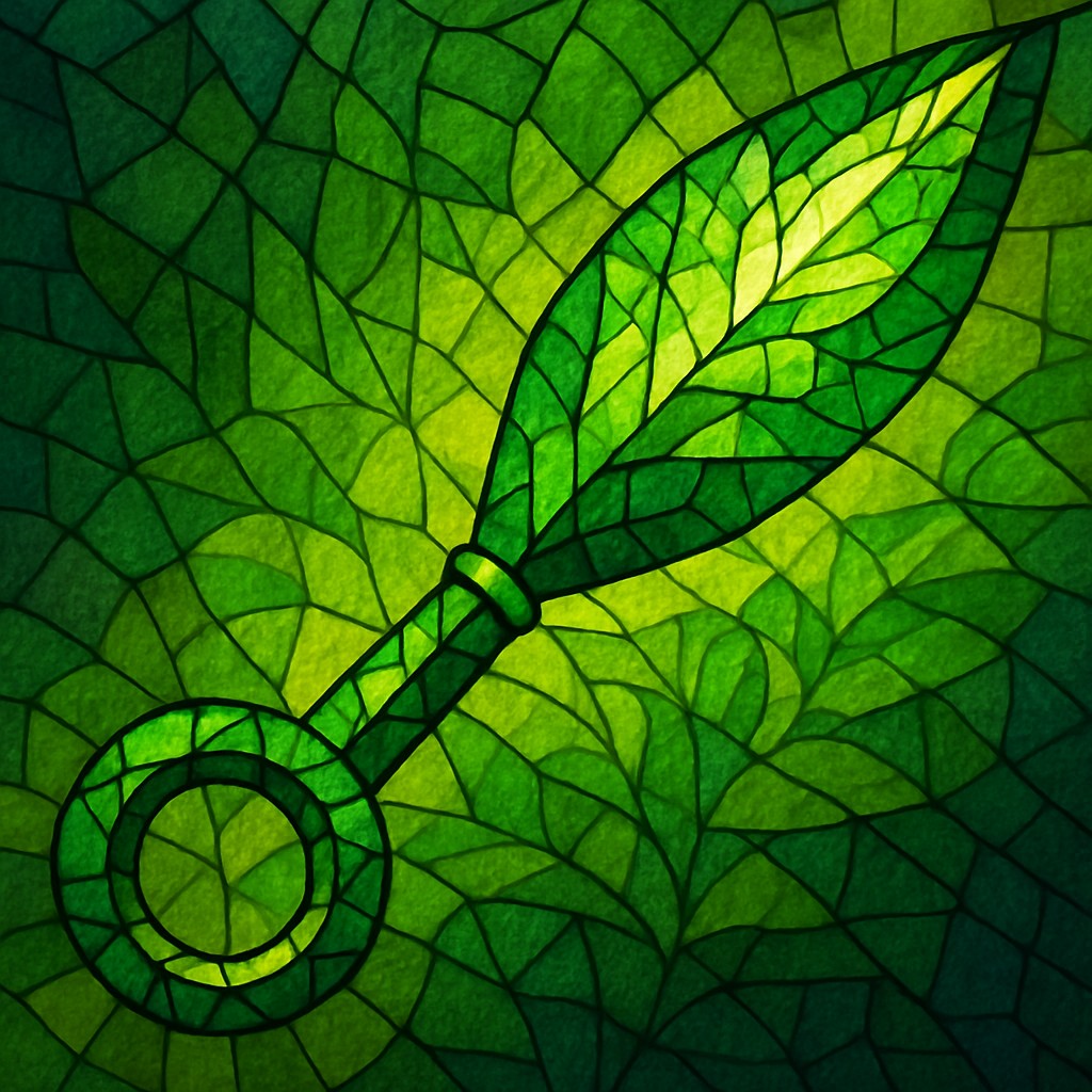 This digital artwork features an abstract mosaic kunai rendered in vivid greens, yellows, and hints of blue, symbolizing the life element. The design mimics stained glass, with irregular tile segments bordered by dark lines to emphasize structure and contrast. The blade of the kunai takes on the form of a leaf, radiating vitality and growth, while the handle and ring maintain a geometric symmetry that grounds the organic motif.