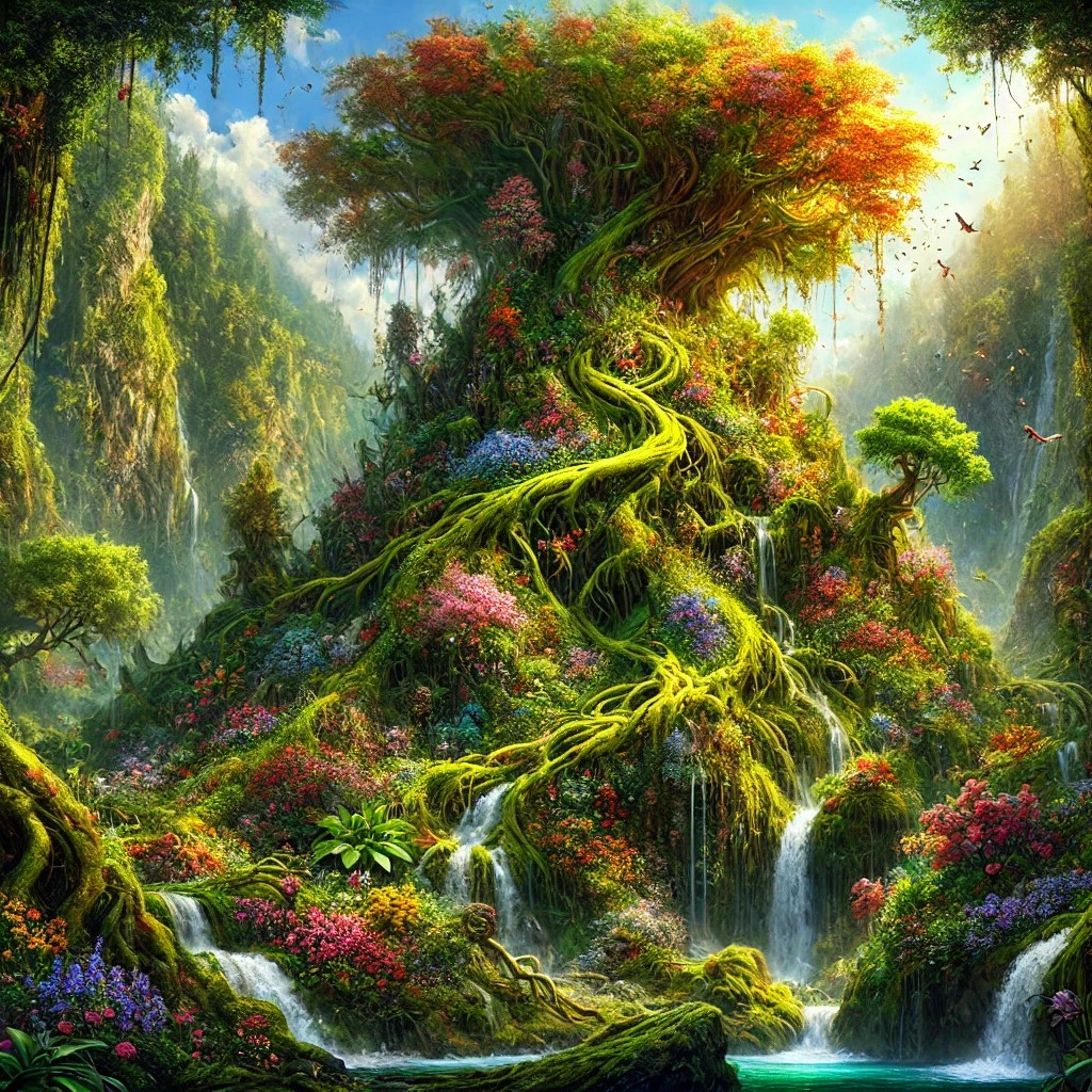 A towering mountain covered in lush, verdant greenery, with every inch of its surface brimming with life. The slopes are adorned with dense forests, where ancient trees rise majestically, their branches heavy with leaves and blossoms. Vines and flowers of every color wind their way up the mountain, creating a tapestry of vibrant hues. Streams of crystal-clear water cascade down the mountain’s sides, nourishing the rich soil and feeding into sparkling pools below.
