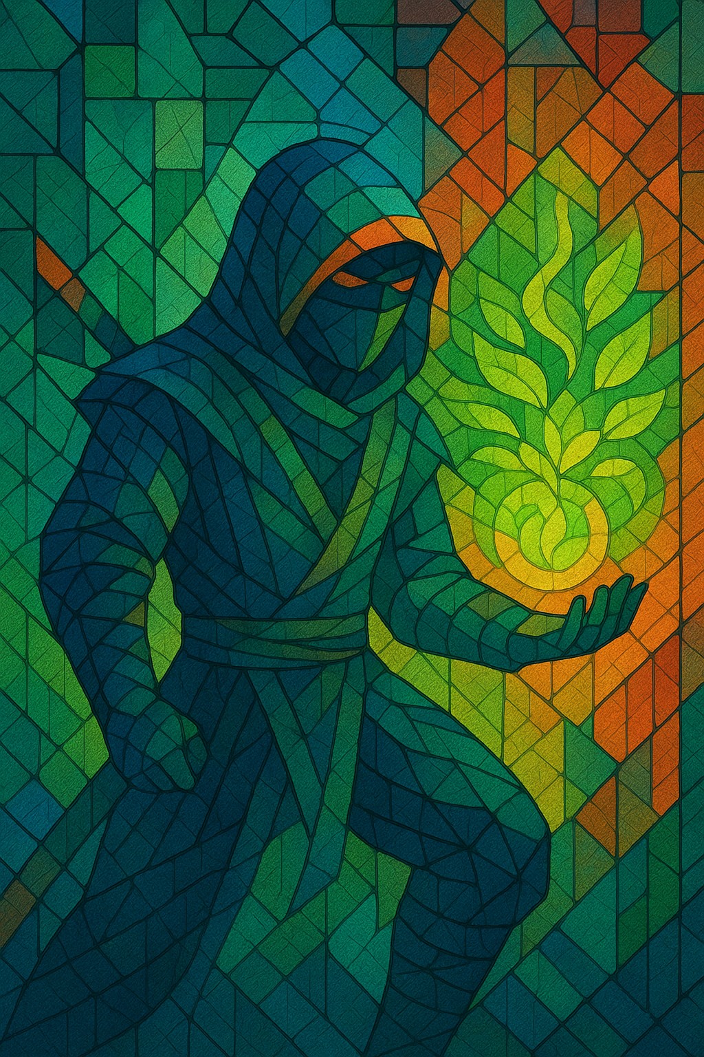 This image depicts a digital abstract mosaic of a ninja figure, composed of vibrant geometric tiles in shades of deep teal, green, orange, and yellow. The ninja is cloaked and masked, standing in a poised, powerful stance. In their outstretched hand, they hold a glowing emblem of the “life” element — illustrated as a radiant, leaf-like flame made of green and yellow tiles.