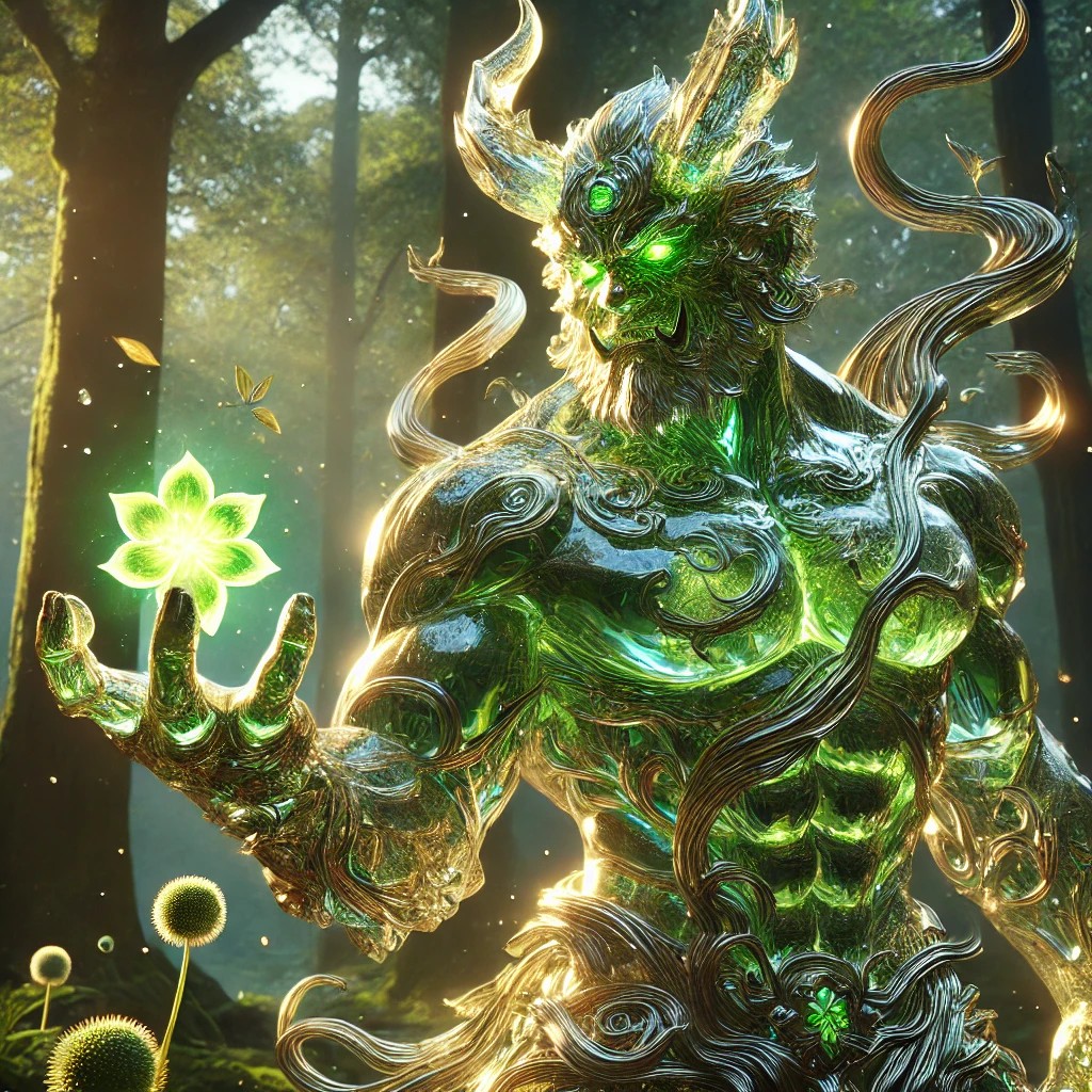 A crystalline sculpture of an oni, carved from radiant, translucent crystal with sleek, organic facets. The oni stands tall and powerful, with a muscular frame and curved horns rising from its head. Unlike traditional depictions of wrath, this oni embodies life and vitality. Glowing green and golden light flows through its crystal body like energy veins, softly illuminating the etched vines and floral motifs that decorate its limbs and armor-like torso. One of its strong hands is extended forward, gently cradling a glowing blossom of energy—symbolic of the life element. Its fierce eyes have a wise, nurturing expression.