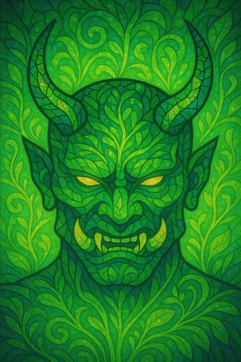 This artwork depicts a powerful Oni rendered as an intricate digital mosaic, radiating the vitality of the life element. The figure’s fierce horns, sharp tusks, and intense golden eyes are framed by swirling, leaf-like patterns that weave across its face and body, blending seamlessly into the vibrant green background. Each “tile” of the mosaic shimmers with organic textures, evoking the veins of leaves and the flow of nature’s energy.