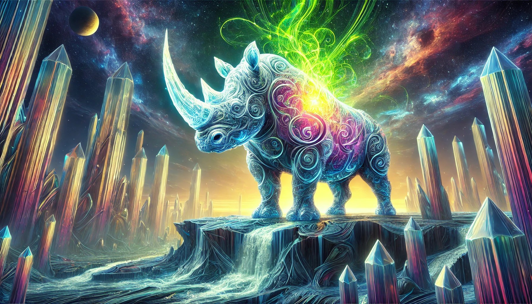 This digital artwork depicts a majestic crystal rhino, intricately designed with glowing neon swirling patterns. The rhino’s body is made up of translucent, luminous crystals with sharp, angular facets that reflect and refract the light around it. Its form is vibrant, showcasing a mix of cool blues, purples, and greens that shimmer in the light.