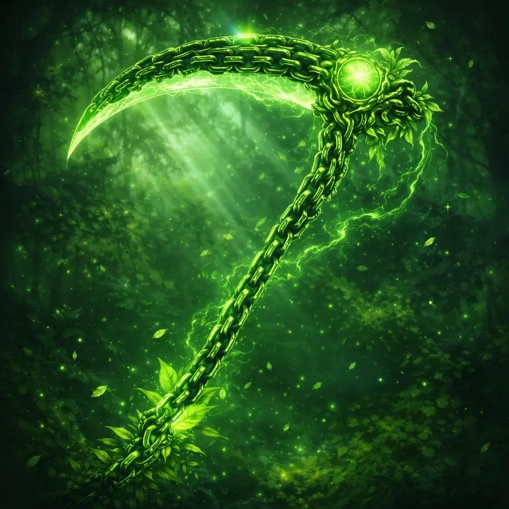 The image depicts a scythe crafted from vibrant, glowing green chains, with the blade and handle formed seamlessly from the interconnected links. At the top of the scythe, an ethereal orb pulses with life energy, surrounded by intricate vine-like tendrils and leaves, symbolizing the force of nature. The environment around the scythe is a mystical forest, bathed in soft green light, with rays of sunlight filtering through the trees.