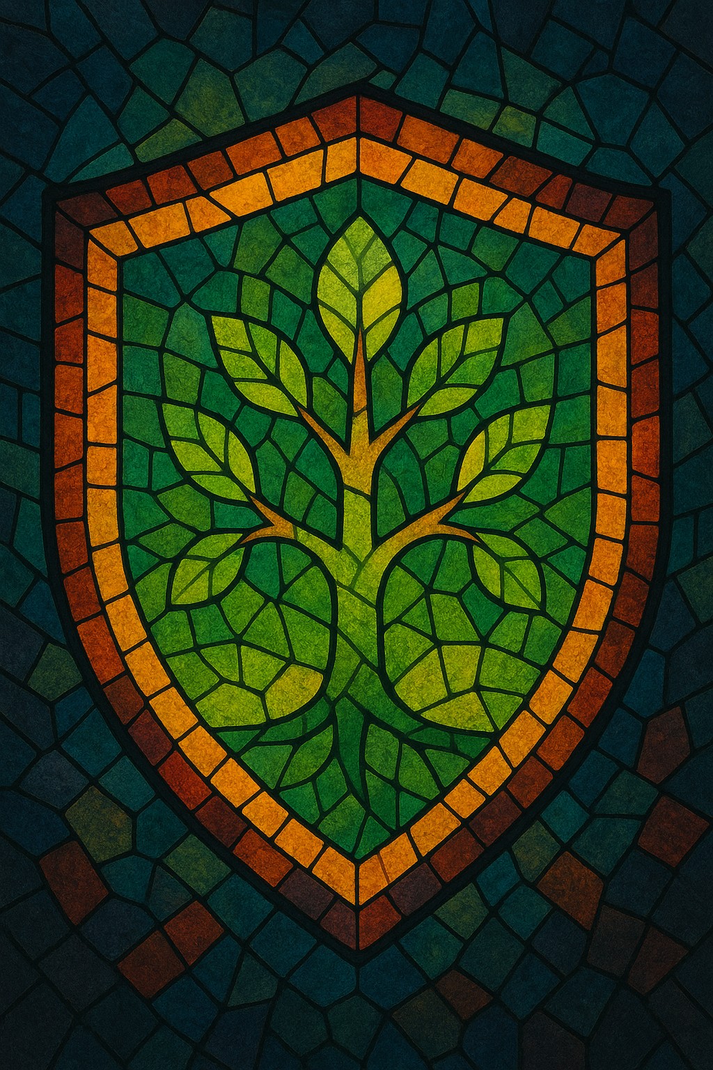 This image depicts a radiant digital mosaic in the shape of a medieval shield, crafted in a stained-glass style. At the heart of the shield lies a stylized tree, symbolizing the element of life, with vibrant green and yellow branches sprawling outward like veins of energy. The shield is bordered with warm amber and fiery orange tiles, providing a striking contrast to the cool green tones of the tree.