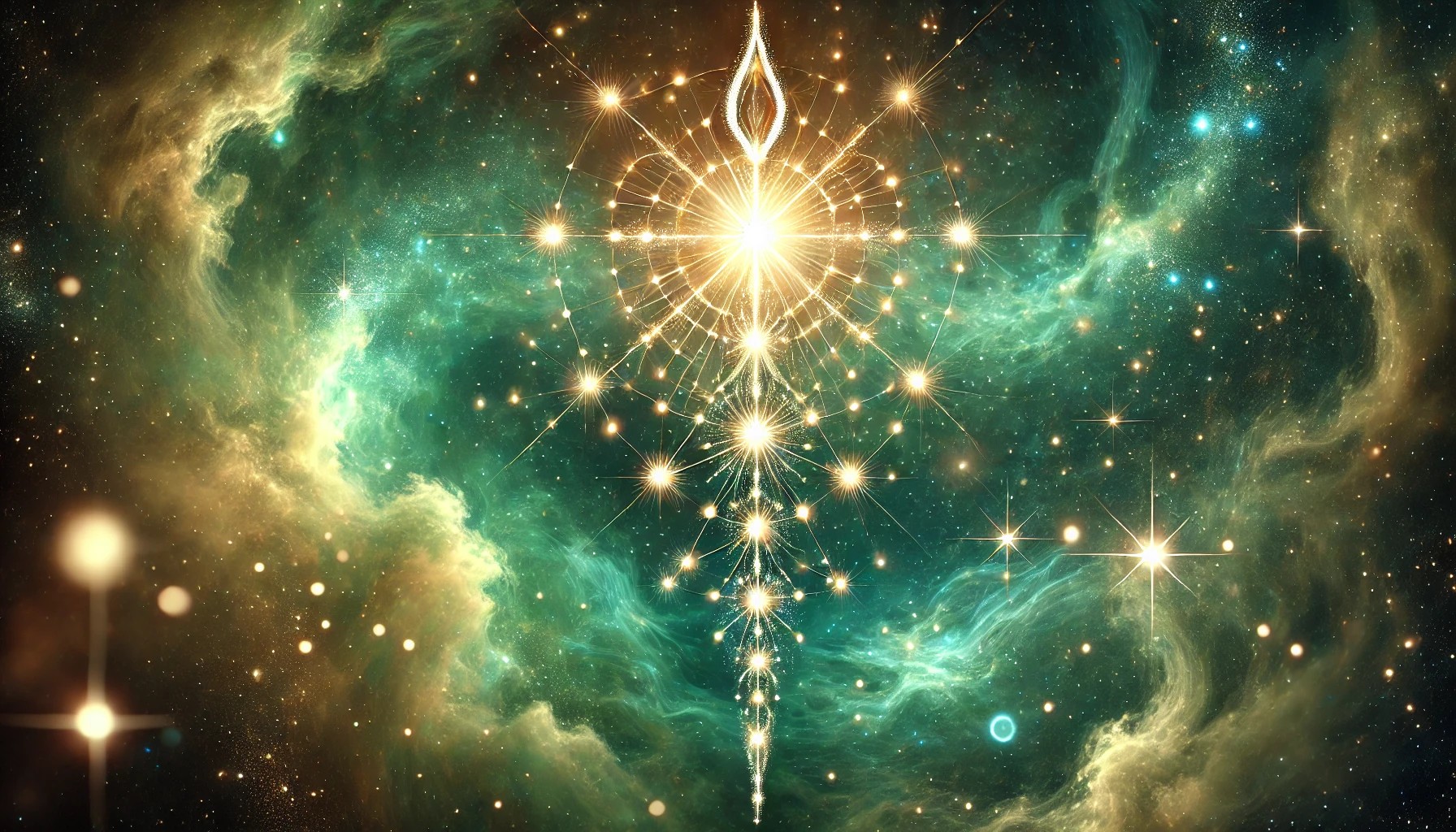 The image depicts a breathtaking cosmic scene featuring a constellation in the shape of a spear, glowing with the essence of the life element. The spear is composed of bright, interconnected stars that emit a soft green and golden aura, symbolizing vitality and renewal. Each star pulses with energy, forming intricate celestial patterns resembling the veins of a living entity.