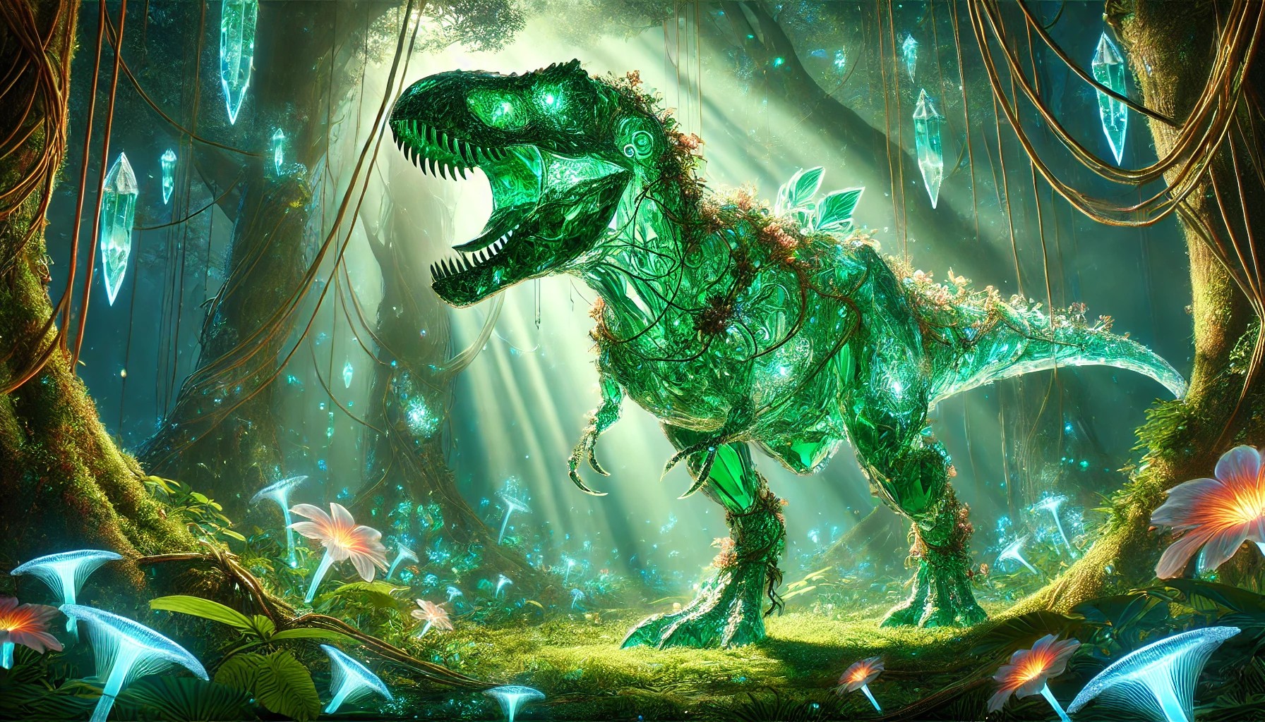 The T-Rex is crafted from emerald-green crystal, glowing with an inner light, while vines and bioluminescent flowers intertwine with its form.