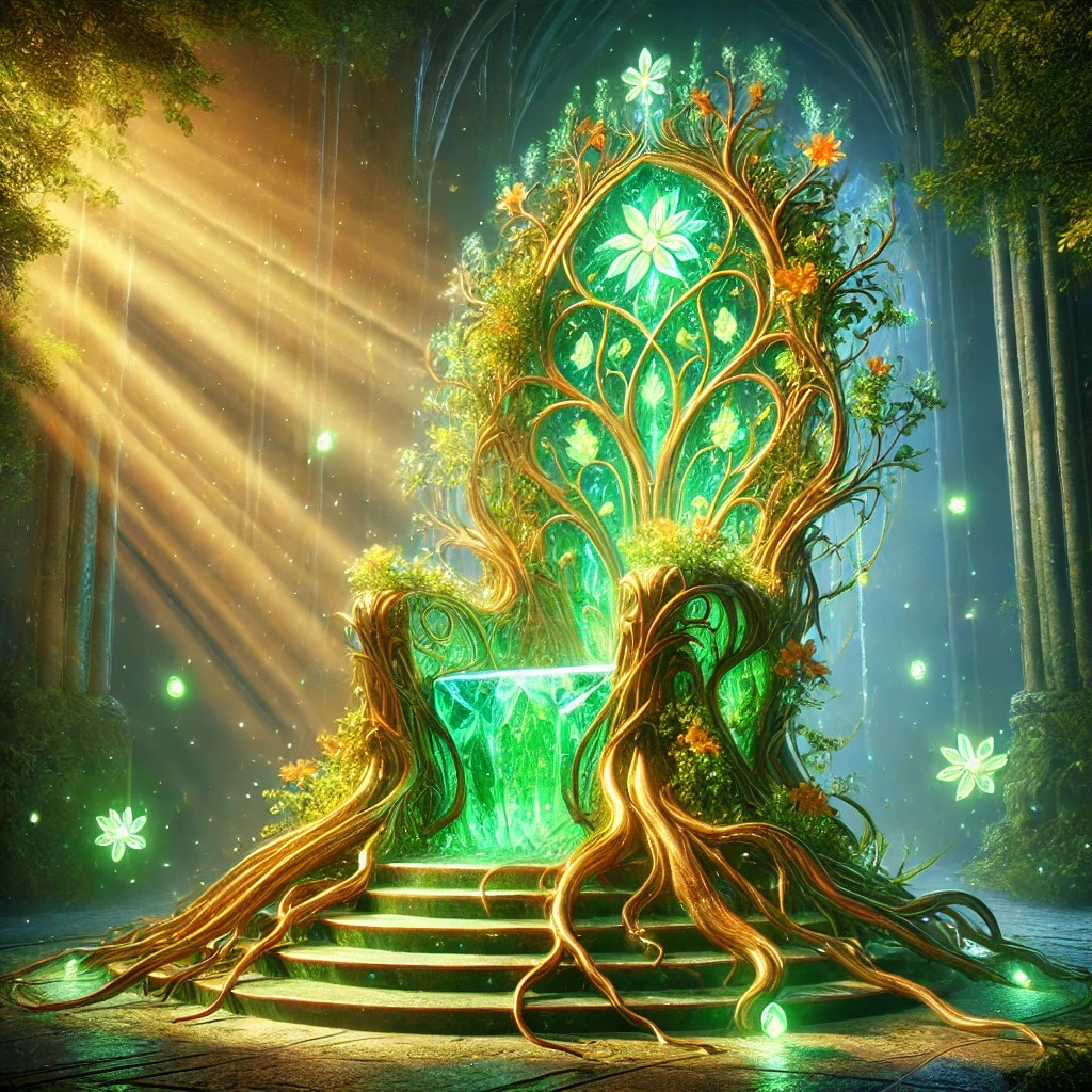 A magnificent throne sculpted entirely from radiant, translucent crystal infused with the essence of life. The throne glows with vibrant green and golden hues, symbolizing nature’s endless vitality. Elegant vines and delicate blooming flowers are naturally embedded within the crystalline surface, their intricate patterns winding up the armrests and backrest like living art.