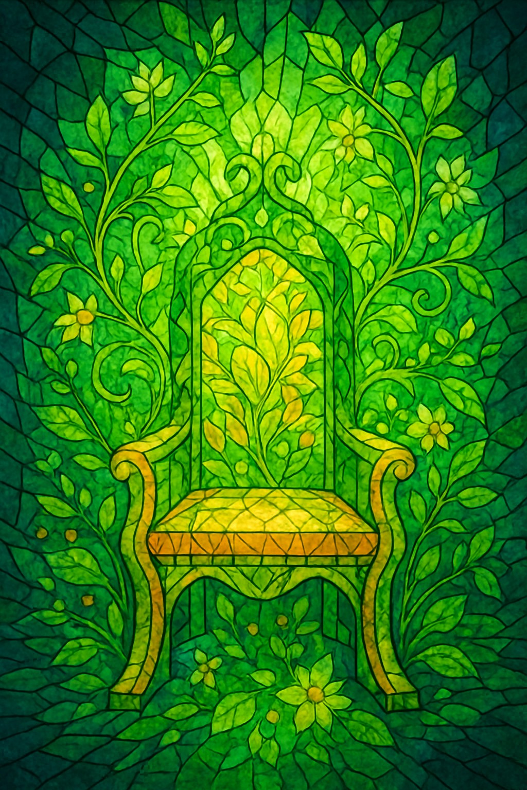 The image depicts a radiant stained-glass mosaic of a throne, glowing with the essence of life. The throne itself is golden and majestic, its form defined by intricate patterns of swirling green vines that weave seamlessly into the surrounding design. Lush foliage, leaves, and blooming flowers spread outward, creating a sense of abundance and vitality.