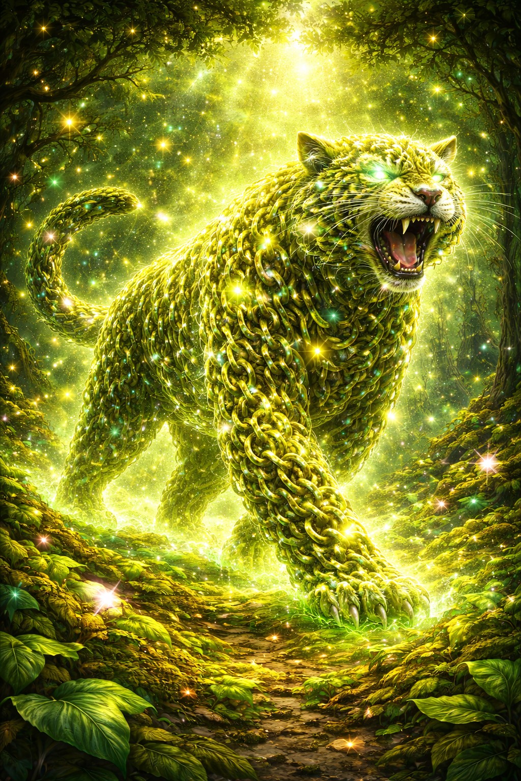 The image portrays a magnificent tiger made entirely of glowing chains and vines, exuding the life element. Its body is intertwined with luminous green chains, resembling vibrant vines, adorned with sparkling leaves and small flowers. As the tiger moves through an enchanted forest, its fur-like vines shimmer with a golden glow, bringing the entire scene to life.