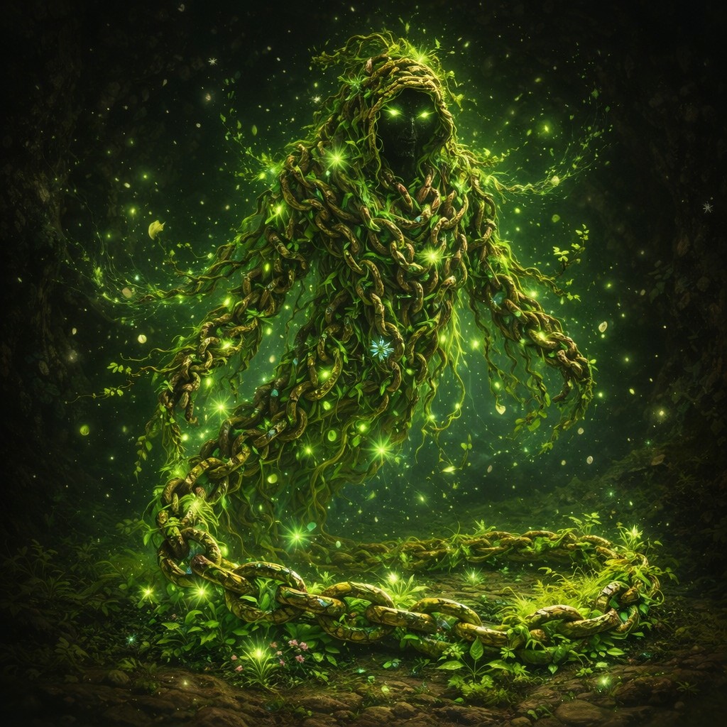 The life-wraith rises from a coil of living chain, each link a twist of bark, vine, and moss shot through with emerald light. Its body is a tattered silhouette of branches and creeping ivy, shaped like a hooded figure with no visible face—only two piercing green eyes burning in the darkness beneath the cowl. The chains drape from its shoulders like a living cloak, sprouting tiny leaves, flowers, and glowing spores that drift into the air like fireflies.