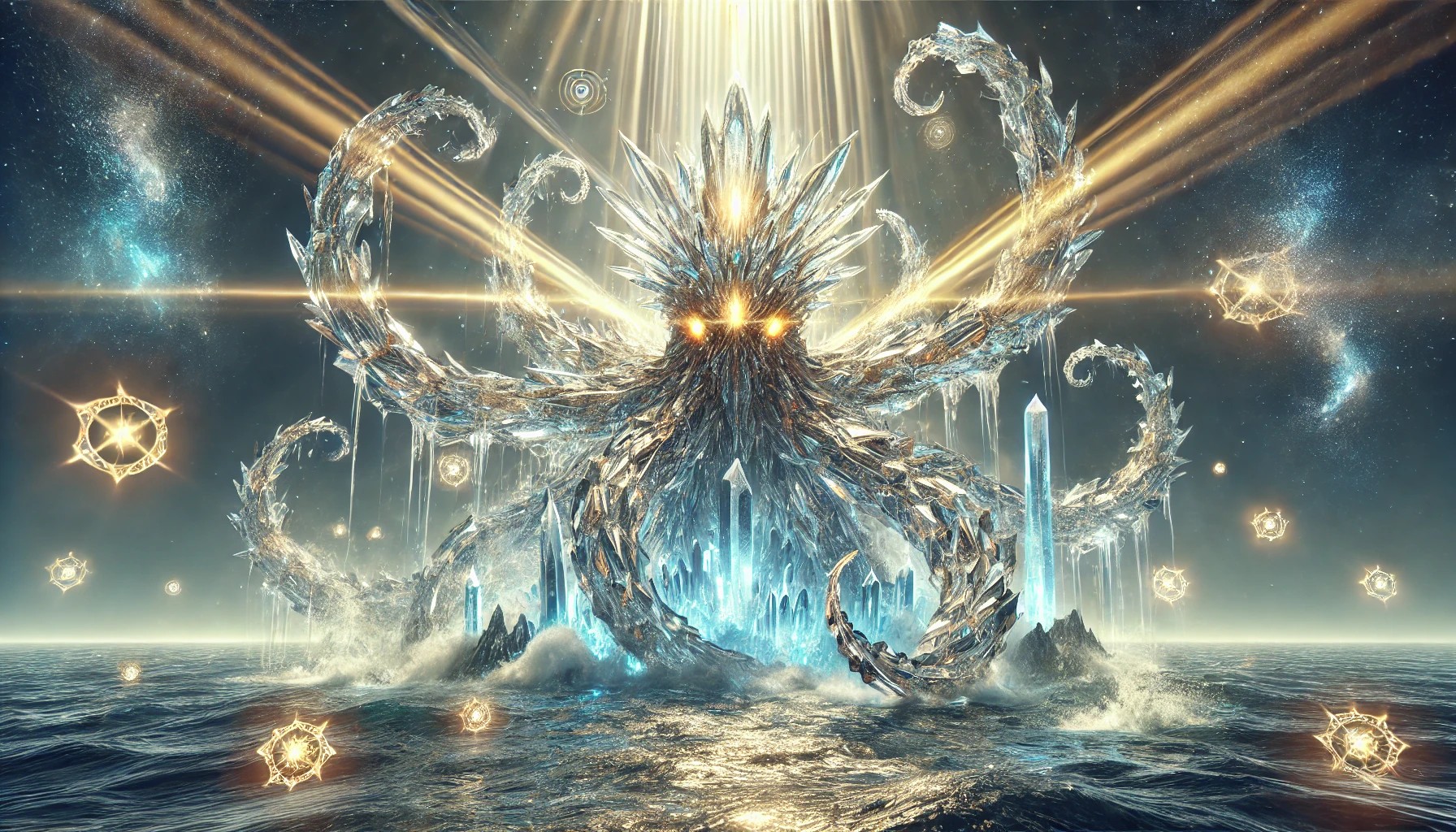 This breathtaking artwork depicts a colossal Crystal Kraken, an ancient being infused with the power of light, emerging from the depths of a glowing, ethereal ocean. Its massive, translucent crystal tentacles stretch outward, refracting golden and white light, casting divine radiance across the misty sea. Each crystalline shard that forms its body shimmers with celestial energy, pulsating as if alive with an unseen cosmic force.