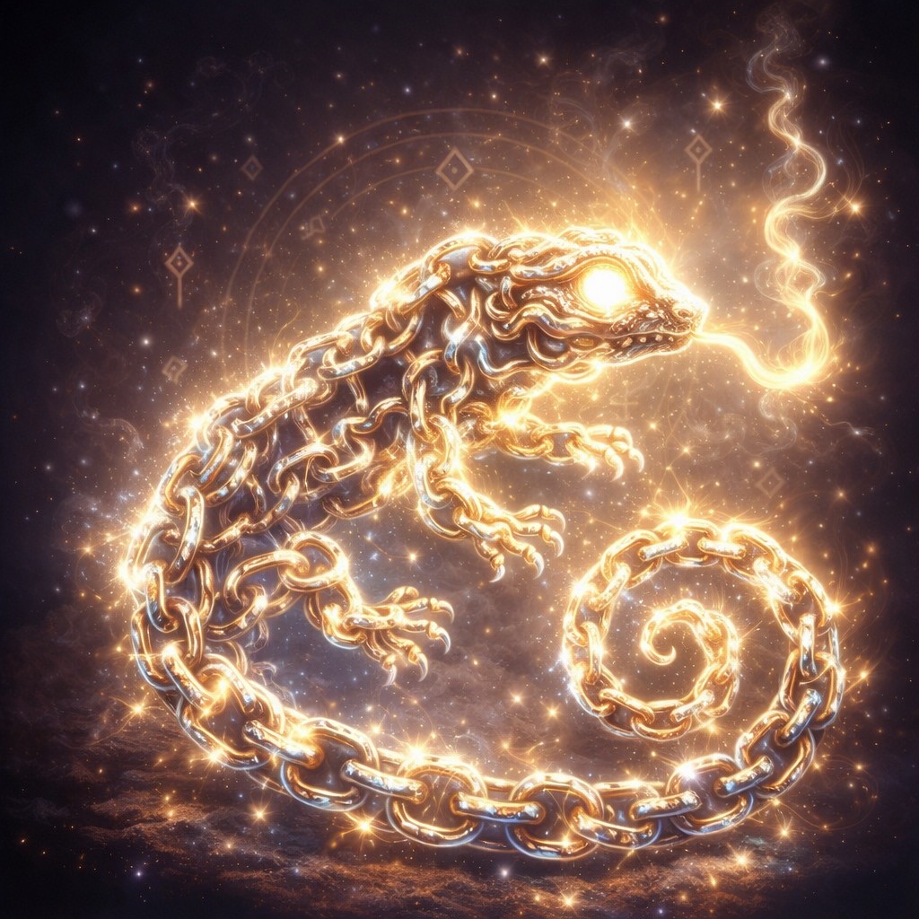 A lizard formed entirely from heavy, interlocking chains coils in a loose spiral, its body blazing with molten gold light. Each metal link gleams as if filled with liquid sun, throwing off tiny sparks and star-like embers that drift through the surrounding darkness. Its eye burns like a miniature star, and a bright, smoke-like ribbon of light pours from its mouth, curling into the air like luminous breath.