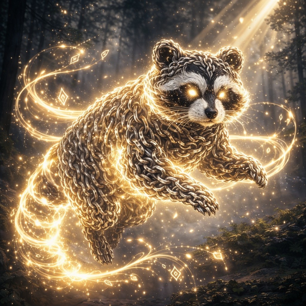 A luminous raccoon forged from interlocking metal chains leaps through a twilight forest. Each link catches a warm, golden-white glow that flows along its body like liquid light, outlining the mask, ears, and deft little paws. Its eyes burn softly, and a ribbon of radiance wraps the ringed tail, trailing sparkling motes and runic flickers through the air.