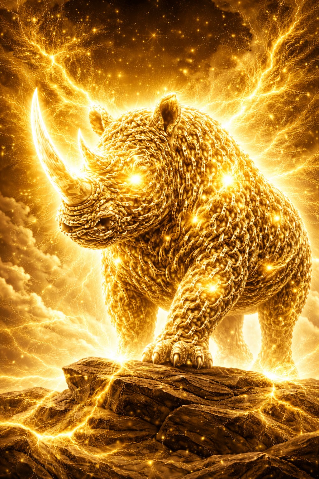 A massive rhinoceros made entirely of interlocking golden chains stands on a cracked stone outcrop, radiating pure light. Its body is a dense armor of metal links, layered so thickly they resemble overlapping scales, each one glowing with a warm, sunlike sheen. Bright nodes of energy burn beneath the chains along its shoulders, chest, and flanks, as if miniature stars are trapped inside its body.