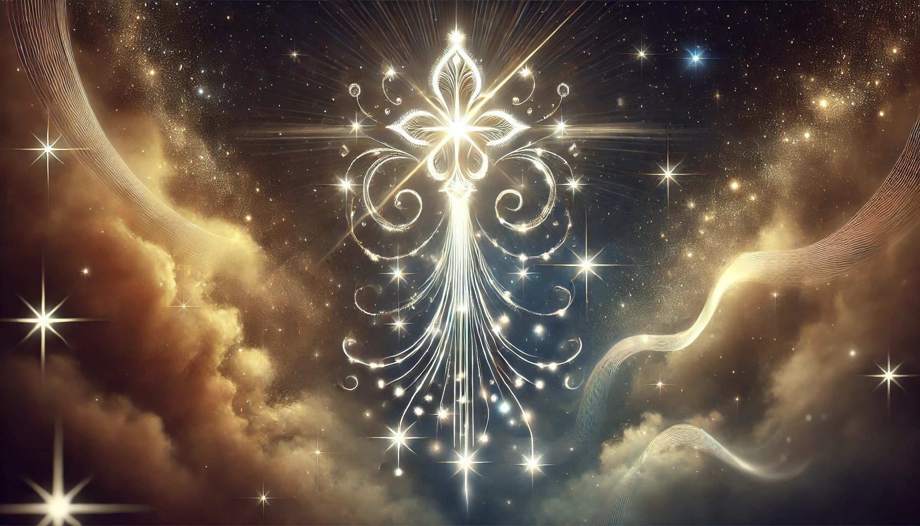 The image features a glowing constellation in the shape of a regal scepter suspended in the vast expanse of a star-filled night sky. The scepter is composed of brilliant, silver-white stars connected by luminous lines, forming its elegant structure. At the tip of the scepter, a radiant, jewel-like star glows intensely, symbolizing the power of the light element. Surrounding the scepter, soft waves of golden and white light ripple outward like cosmic beams, casting a mystical glow.