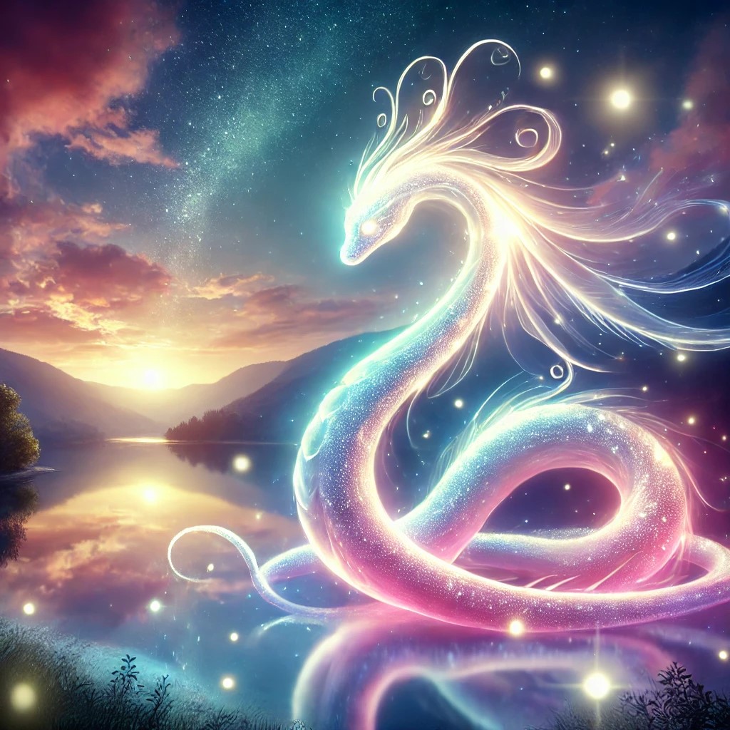 Light snake, a majestic serpent composed of pure, radiant light. Its body shimmers with a spectrum of colors, glowing with an ethereal luminescence. The snake glides gracefully through a serene, twilight sky, surrounded by soft, glowing orbs that float around it.