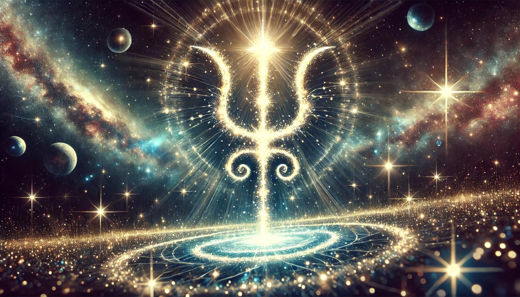 Your celestial trident constellation radiates divine energy in the vastness of space. The trident is composed of brilliantly interconnected stars, forming a majestic and mythical design. Each point of the trident glows with an ethereal golden-white and soft blue light, symbolizing purity, wisdom, and power. Swirling nebulas and distant galaxies surround the constellation, casting a luminous glow that enhances its celestial presence.