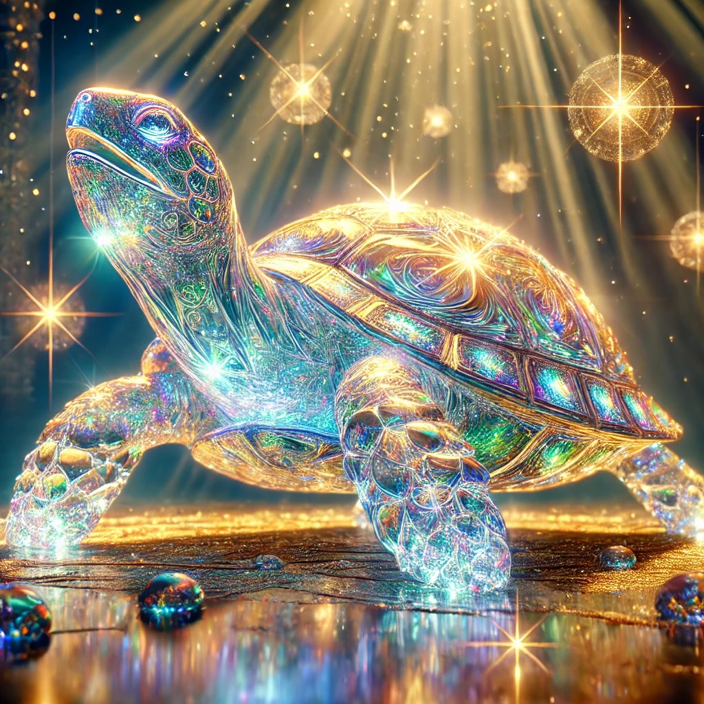 The image features a breathtaking crystal turtle infused with the power of light, resting peacefully in an ethereal, glowing landscape. The turtle’s body is made of translucent, radiant crystal, reflecting prismatic colors as it catches the ambient light. Its shell emits a divine golden glow, adorned with intricate, sacred patterns that pulse with celestial energy. The turtle’s eyes shimmer like miniature stars, and beams of soft, radiant light gently extend from its limbs, enhancing its mystical presence.