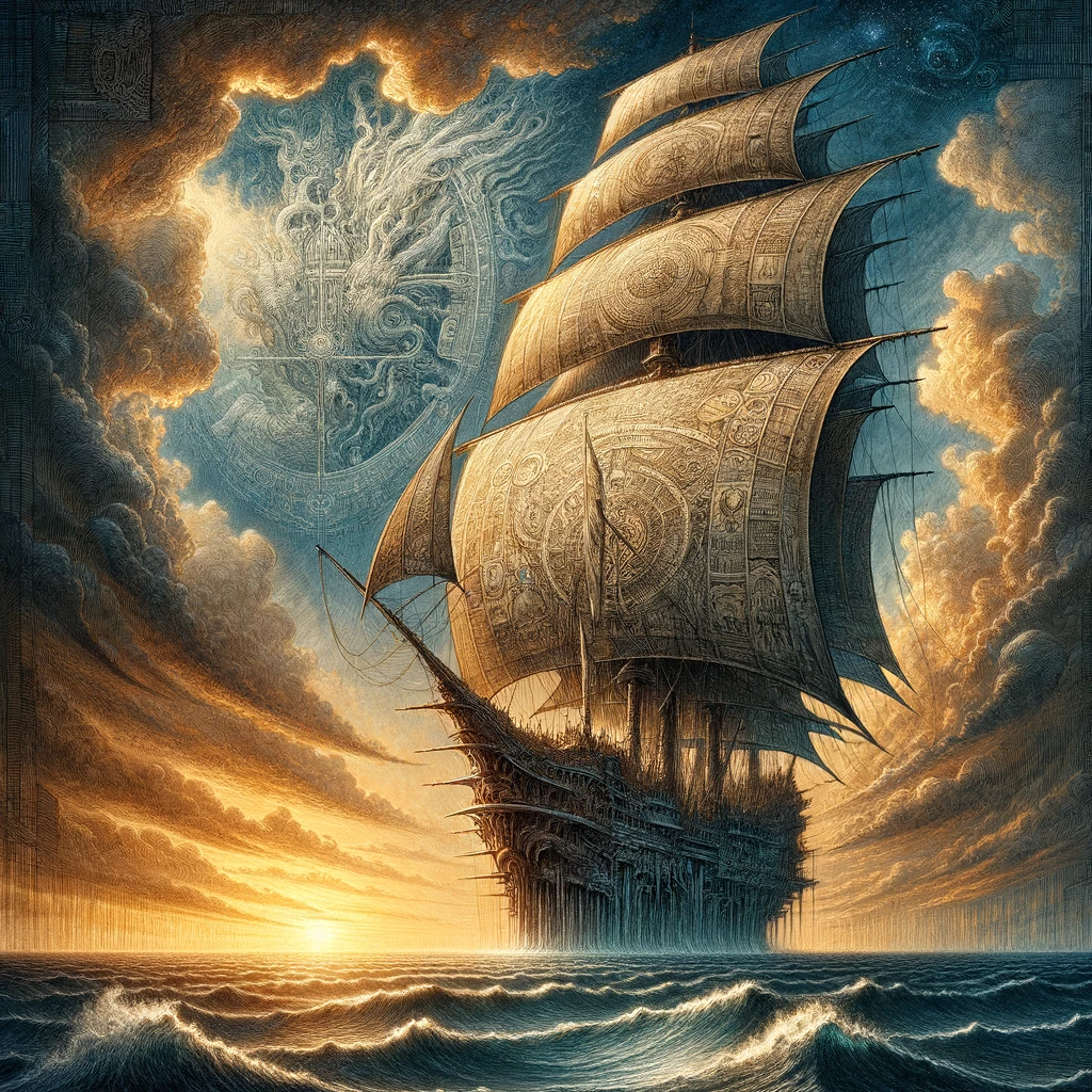 In an imaginative drawing, a colossal sail dominates the canvas, stretching high above a boundless ocean expanse. Attached to a fantastical ship, barely visible below, the sail billows with mythical grandeur. Its sheer size hints at the immense adventures awaiting on the horizon, inviting viewers into a world of limitless possibility.