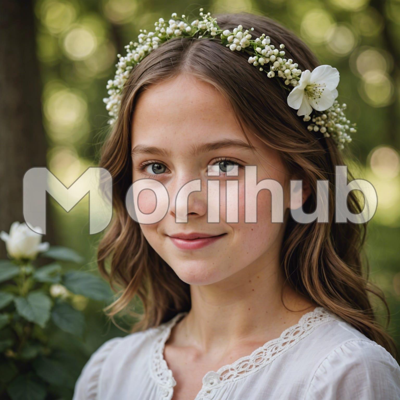 A cute little girl beams with radiant joy, her eyes sparkling like morning dew. Adorned with a delicate flower laurel in her hair, she exudes an aura of natural charm and innocence. Her smile, as bright as the midday sun, illuminates the room and warms every heart in its reach. With each giggle, she brings a touch of magic to the world, infusing every moment with boundless happiness and wonder. In her presence, beauty blooms effortlessly, and the air is filled with the sweet fragrance of her infectious laughter.