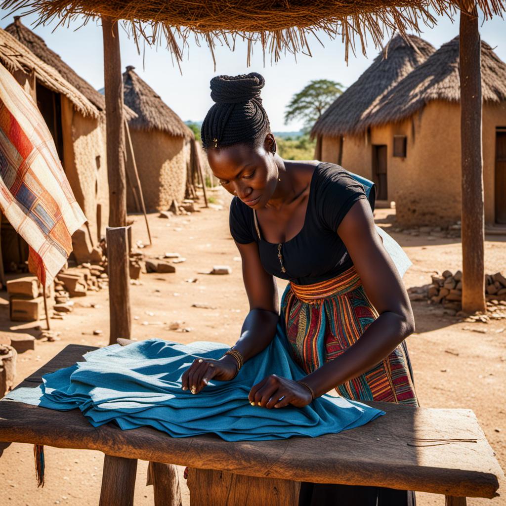 Beneath the clear African sky, a woman in vibrant traditional attire sits in the heart of her village, skillfully weaving cloth. Surrounded by rows of thatched huts, the rhythmic clatter of her loom harmonizes with the ambient sounds of the community. Dextrous fingers dance across vivid threads, creating intricate patterns that mirror the rich tapestry of her heritage. The scene unfolds against a backdrop of warmth and unity, where the artistry of fabric-making becomes a testament to cultural resilience and communal spirit.