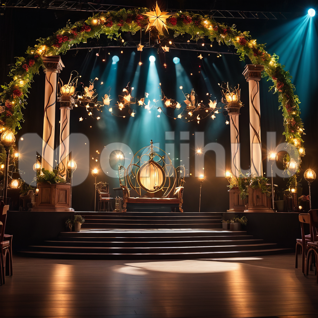 Upon the stage, a tapestry of enchantment unfolds. Ornamental stars, suspended above, cast a celestial glow, their twinkling lights illuminating the atmosphere. Amidst this celestial backdrop, a solitary metal chair stands at the center, a testament to anticipation and potential. Each element intricately woven, the stage becomes a realm of dreams, where the convergence of light and form ignites the imagination, promising a performance as captivating as the starry heavens above.