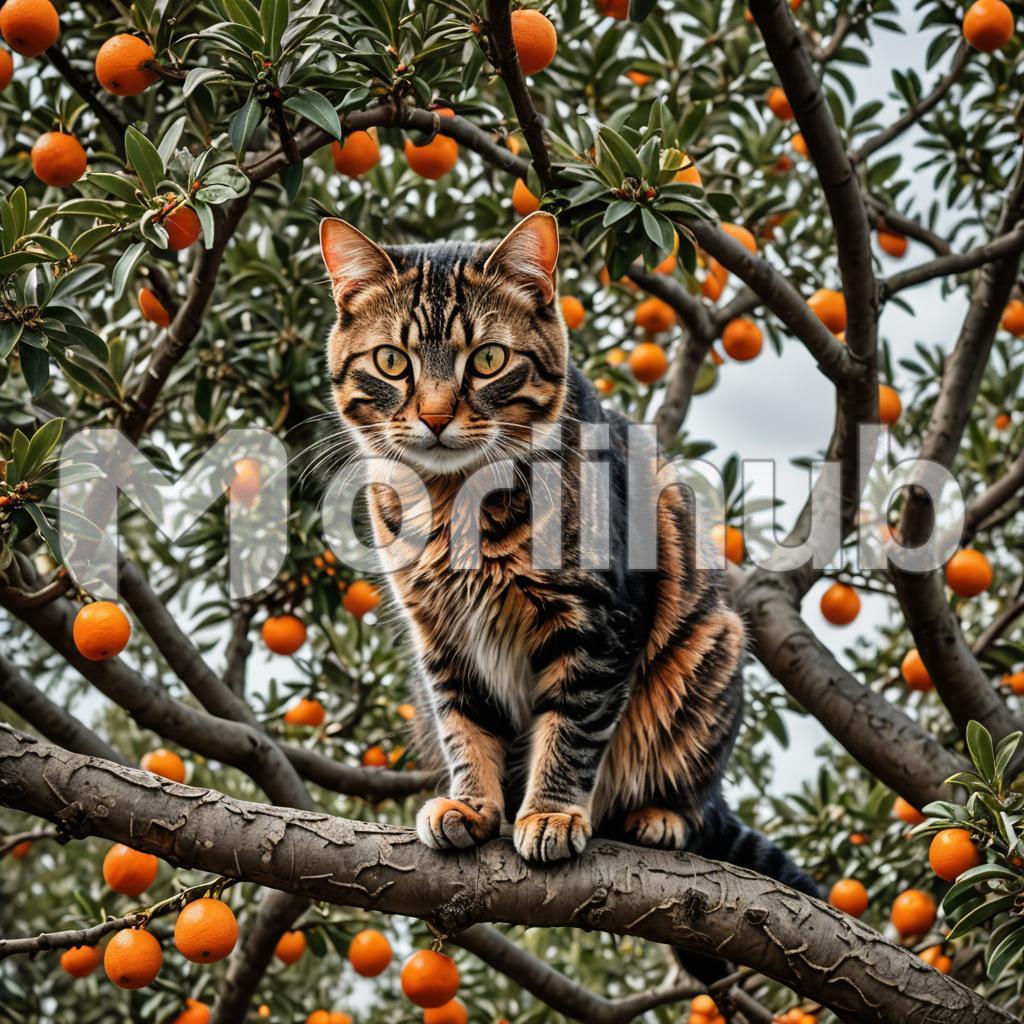 Perched gracefully on a branch of the orange tree, the cat surveyed its surroundings with a mix of curiosity and contentment. The vibrant green leaves and bright orange fruits provided a stunning backdrop for the feline’s sleek, fur. Sunlight filtered through the branches, casting dappled shadows and highlighting the cat’s playful eyes. As the gentle breeze rustled the leaves, the cat remained poised and alert, occasionally batting at a nearby orange. The tree, laden with ripe fruits, seemed to welcome its unexpected guest, creating a picturesque scene of nature and tranquility. The cat, in its elevated position, appeared both majestic and serene, a perfect complement to the lush, fruitful environment.