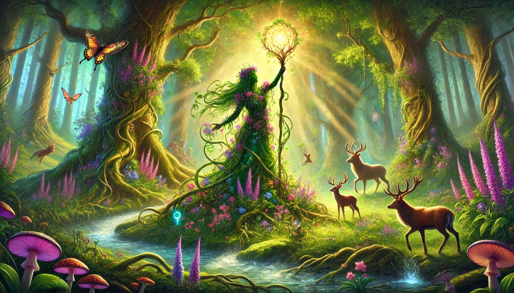 A digital painting depicting a scene where the life element is at the heart of a lush, vibrant forest.