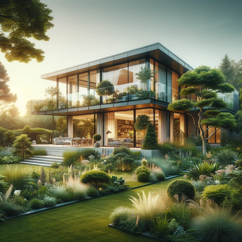 In this captivating image, a luxurious home sits nestled amidst lush greenery, epitomizing serenity and elegance. Its modern design features spacious interiors seamlessly connected to the surrounding nature through large glass windows, inviting ample natural light and offering panoramic views of the verdant landscape. This harmonious blend of architecture and nature creates an idyllic retreat, where tranquility and sophistication coexist in perfect harmony.
