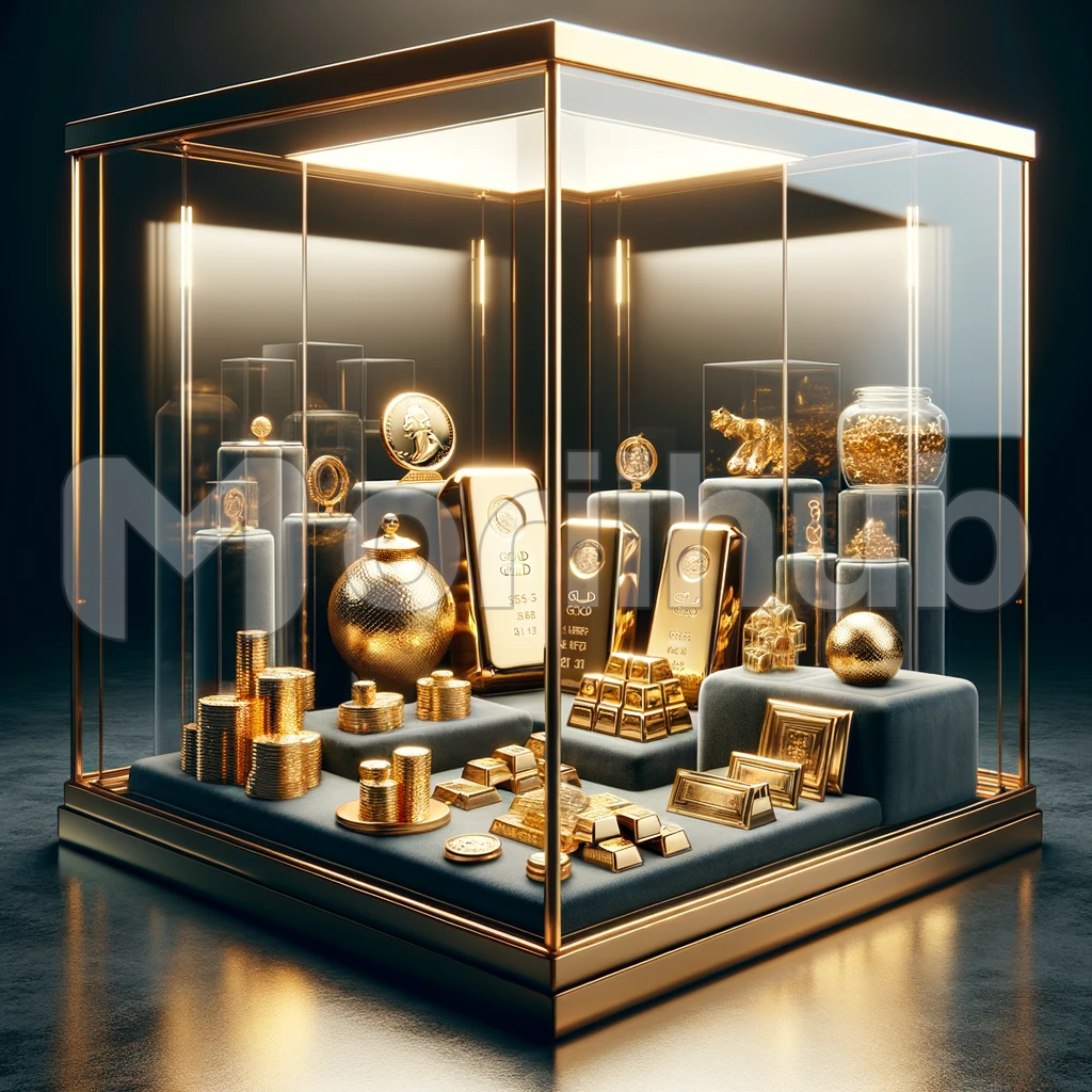 Within a modern, transparent glass structure, an opulent display of gold items unfolds, bathed in the soft, caressing embrace of natural light. Each piece glistens with resplendent elegance, casting shimmering reflections that dance across the pristine glass. This striking juxtaposition of transparency and opulence creates an ambiance of timeless luxury, where the beauty of gold is accentuated by the clarity of design.