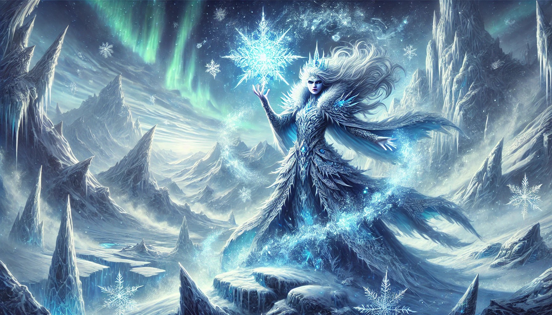 The image portrays a powerful ice mage standing atop a frozen mountain peak, surrounded by an otherworldly winter landscape. The mage wears a flowing, frost-covered cloak adorned with intricate crystalline patterns, shimmering like frozen lace. Their long, silver hair billows in the howling wind, and their piercing ice-blue eyes glow with an ethereal, frigid light. Frost spreads across the ground beneath their feet as they conjure a spiraling blizzard in their hands, sending shards of ice and snow swirling around them.