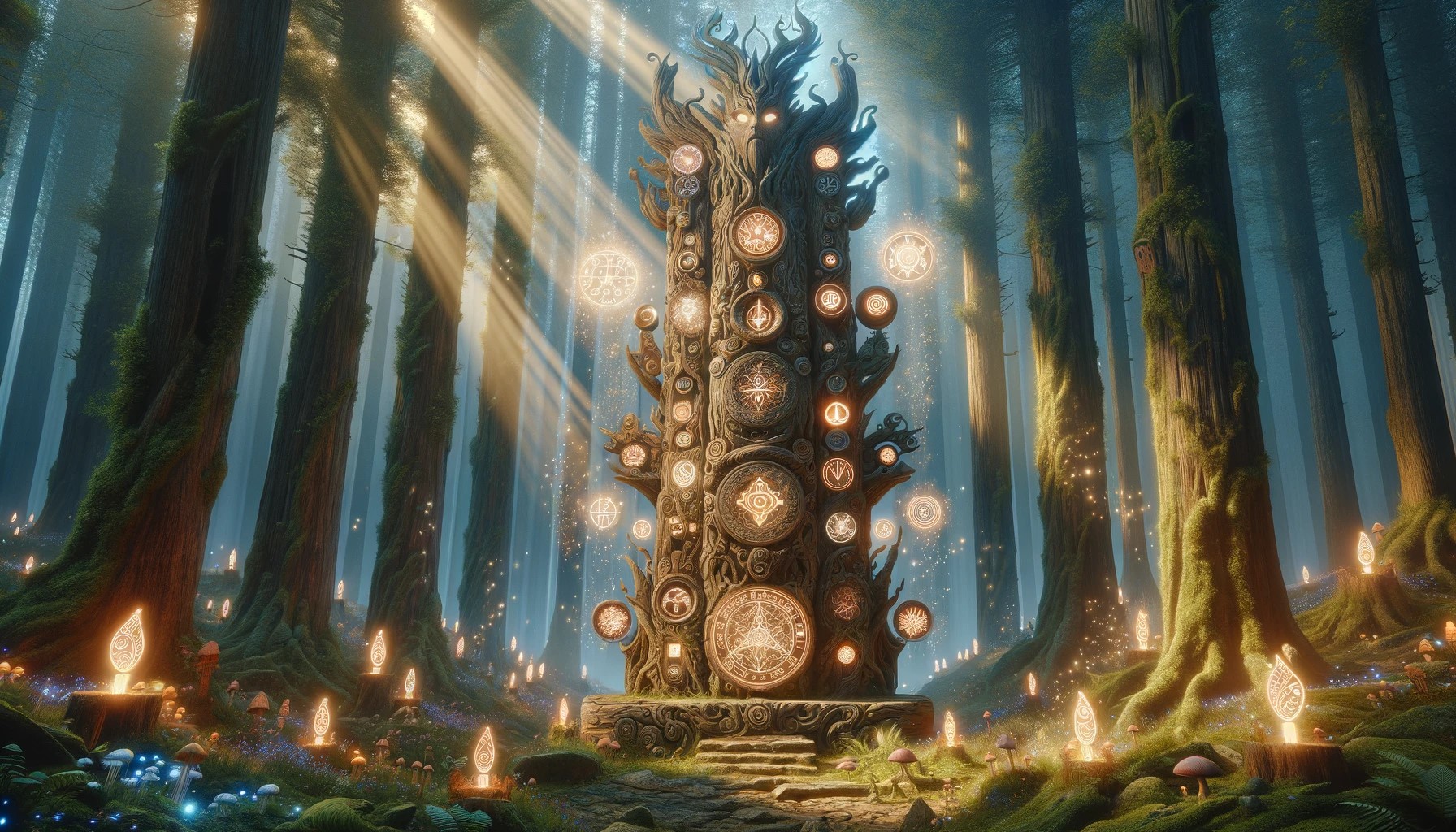 Magic totem standing proudly in the center of an ancient, enchanted forest.