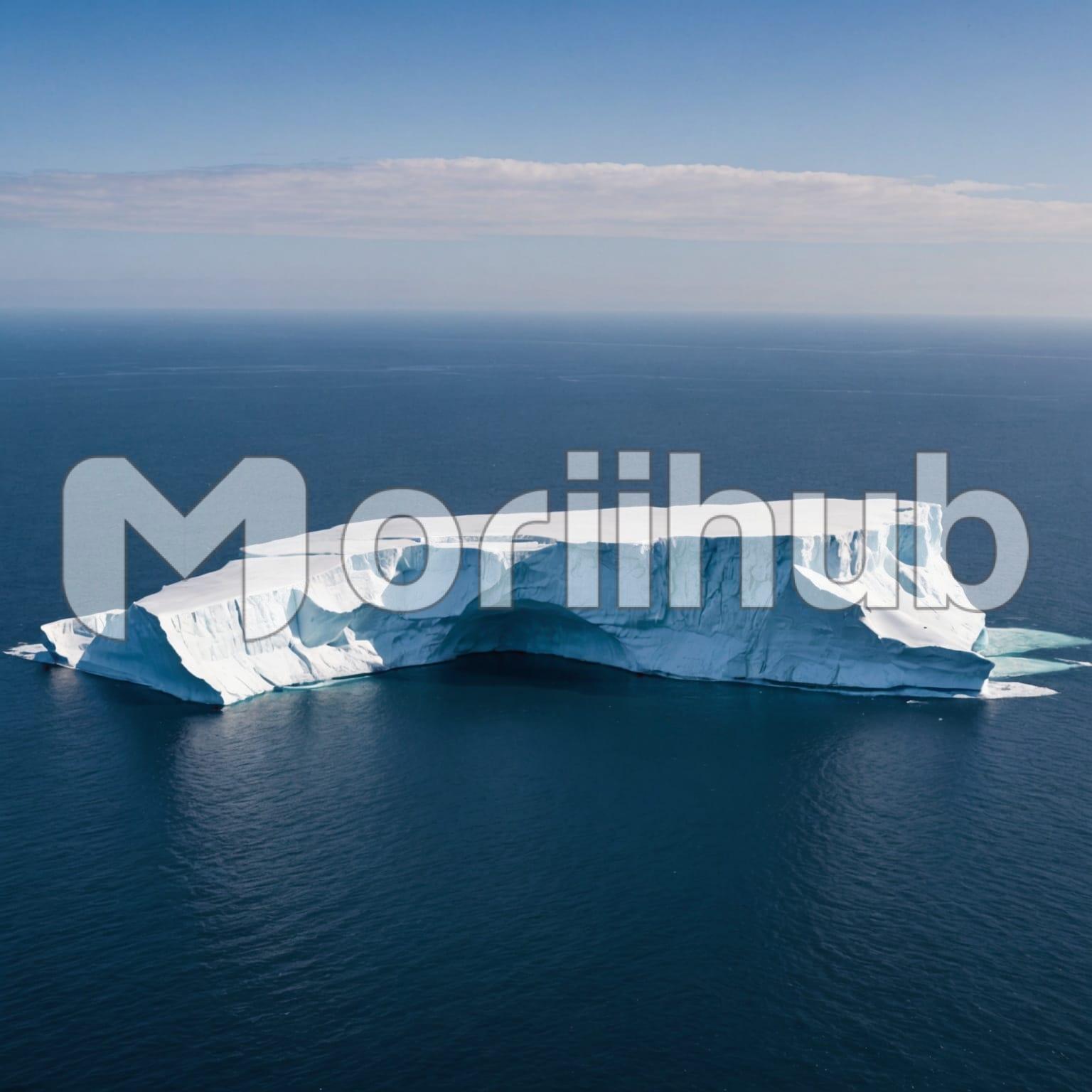 An iceberg floats majestically in the middle of a serene ocean, its massive, icy structure rising starkly against the tranquil blue waters. The calm surface of the ocean reflects the iceberg’s grandeur, amplifying its cool, crystalline hues. The iceberg’s towering, jagged edges contrast beautifully with the smooth expanse of the sea. Around it, the ocean stretches endlessly, its placid quality enhancing the iceberg’s solitary presence. The scene evokes a sense of peaceful isolation and awe-inspiring natural beauty, capturing the iceberg’s silent, majestic solitude.