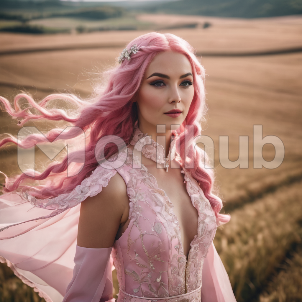 In the midst of a vast field, a woman stands resplendent in a flowing pink gown, the fabric billowing gently in the breeze. Surrounded by nature’s serene beauty, she radiates elegance and grace, a vision of ethereal charm amidst the verdant expanse. With each step, she exudes a quiet confidence, her presence a harmonious blend of strength and delicacy. Against the backdrop of the open sky, she stands as a symbol of timeless beauty and tranquility.