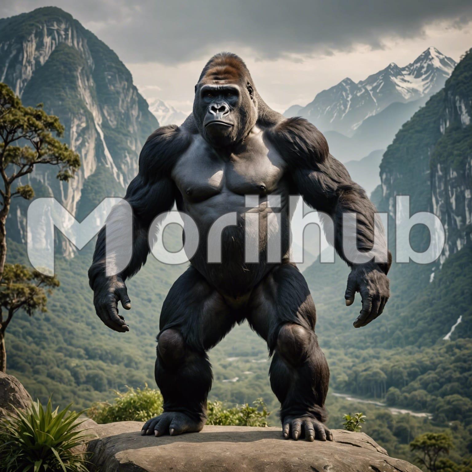 Standing majestically atop a rocky precipice, a powerful gorilla surveys its domain. Behind it, a stunning green valley stretches out, vibrant and teeming with life. Encircling mountains rise grandly, their peaks shrouded in a delicate mist, forming a natural amphitheater around the valley. The lush landscape below is a rich mosaic of dense forests and open meadows. The gorilla, a symbol of strength and serenity, stands as the guardian of this untouched wilderness, embodying the raw beauty and grandeur of the natural world.