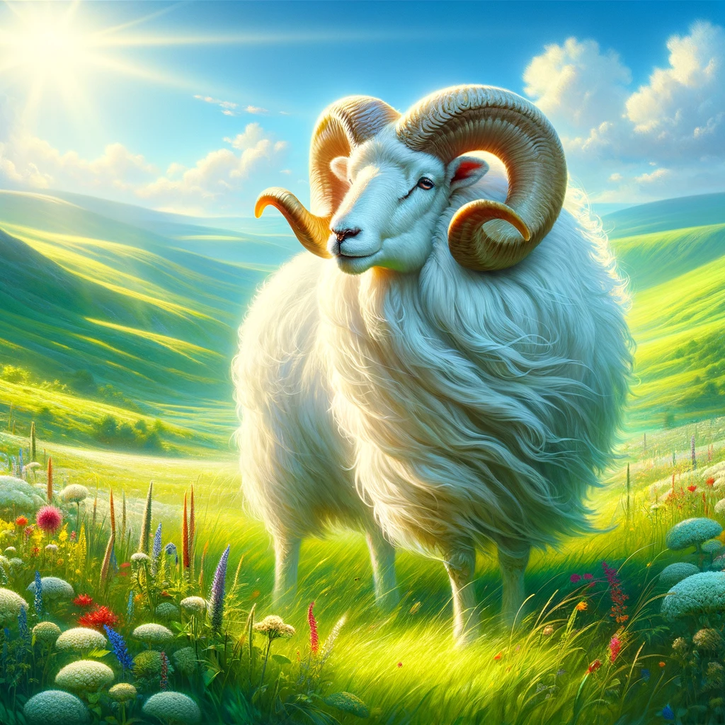 In the heart of a vast, rolling meadow, a serene tableau unfolds. Lush, vibrant greenery blankets the earth beneath a cloudless azure sky. In the midst of this verdant expanse stands a majestic white ram, its presence commanding attention amidst the tranquility of the landscape.