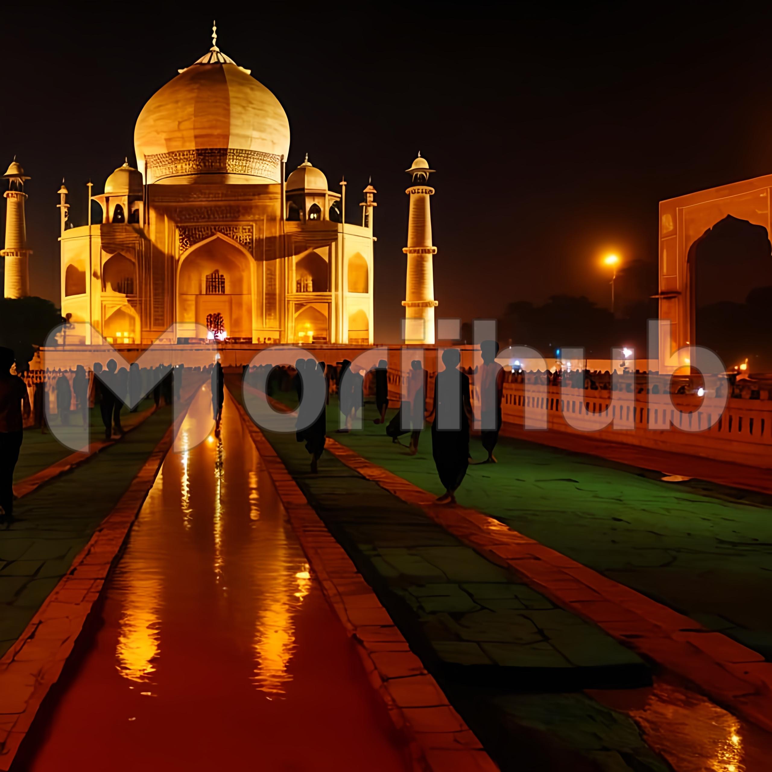 As the evening sun cast its last ethereal glow over the horizon, the Taj Mahal stood as a luminous monument. The darkened sky served as a dramatic backdrop, enhancing the mesmerizing silhouette of the iconic structure. The artificial waterway in front of the Taj mirrored its grandeur, creating a stunning reflection that seemed to stretch infinitely into the dusk.