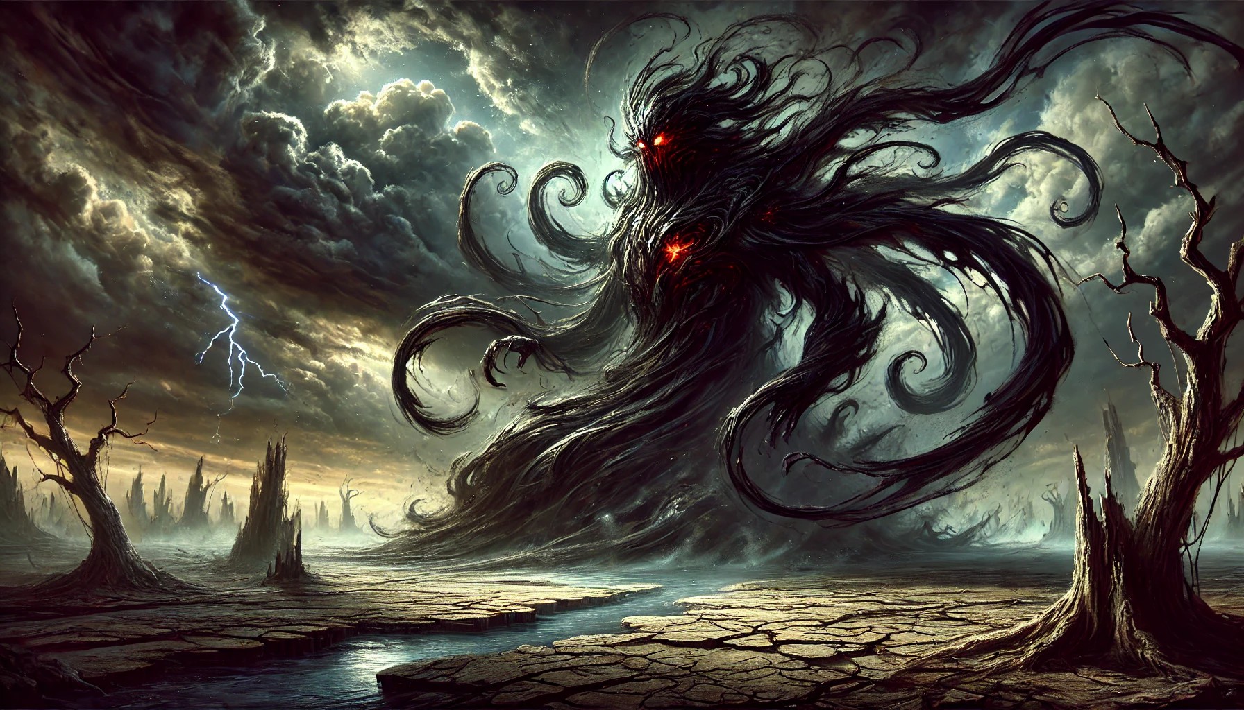 The image presents a Dark Elemental looming over a desolate, stormy landscape. The Elemental is composed of swirling shadows and tendrils of darkness, its massive form exuding a sense of malevolent energy. Its glowing red eyes cut through the shadows, casting an eerie, ominous glow that contrasts starkly with the surrounding pitch-black environment.