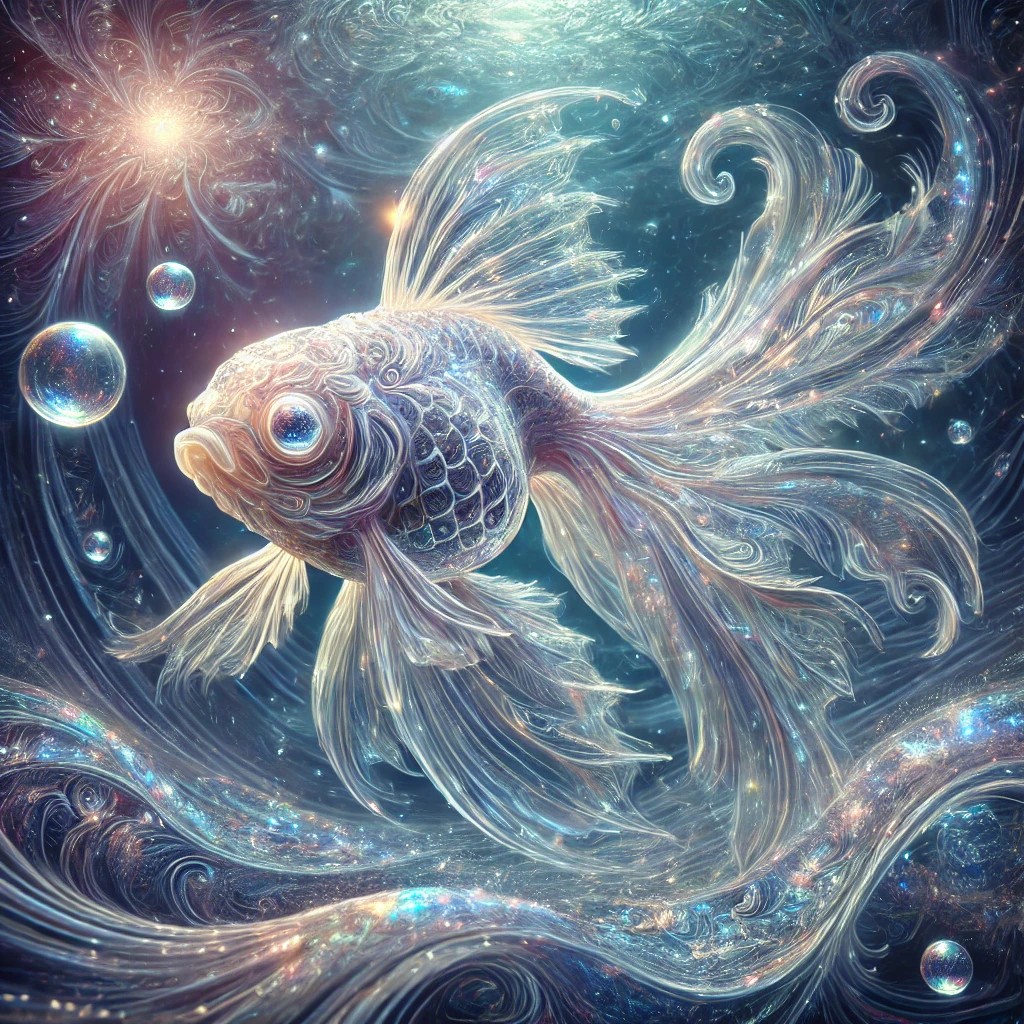 The image showcases a mystical crystal goldfish infused with the mind element, gracefully swimming through an ethereal, dreamlike underwater realm. Its delicate body is sculpted from translucent, shimmering crystal, with radiant energy veins flowing through its elegant fins. The goldfish’s large, glowing eyes exude an aura of wisdom and intelligence, pulsating with psychic energy. As it moves, waves of mental energy ripple through the water, distorting reality with mesmerizing, swirling patterns. Its fins emit a soft, hypnotic glow, leaving trails of luminous energy in its wake.