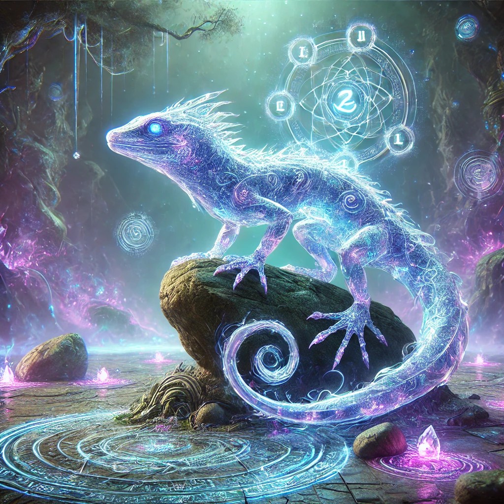 The image showcases a mystical crystal lizard infused with the mind element, perched gracefully on an ancient stone in an enchanted landscape. Its sleek, translucent body glows with radiant hues of violet and blue, with intricate energy veins pulsating beneath its crystalline surface. The lizard’s hypnotic eyes emit an intense, mesmerizing glow, exuding an aura of intelligence and deep psychic power.
